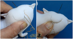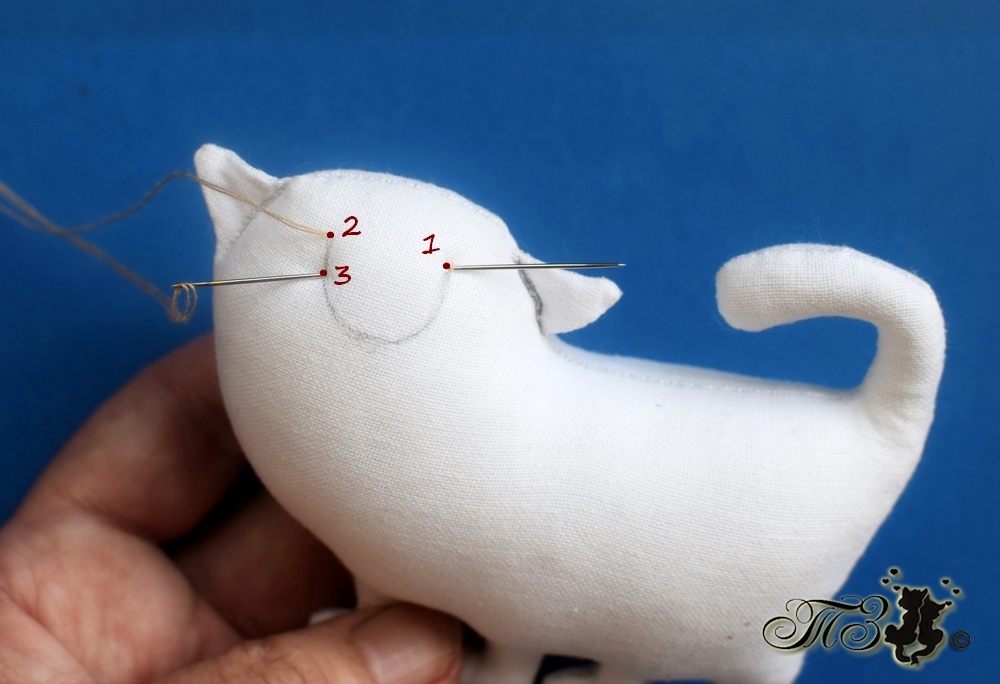 Сначала находим наиболее удачное положение глаз. Следите только, чтобы кончики булавок не выходили за пределы тушки и не подходили острием близко к ткани, иначе, взяв в руки кота, можно будет пораниться!