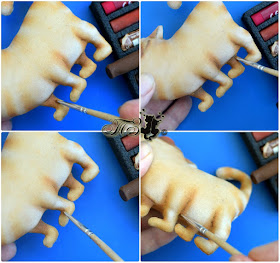 Пальчики на лапках рисуем в виде небольших дуг. Пальчики рисуем с двух сторон! После того, нарисовали пальчики, их можно оттенить темно-коричневой пастелью, тоже для объемности (см. правое нижнее фото в коллаже):