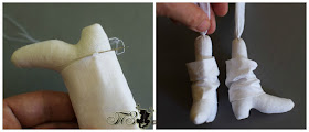 Сапожки подобного рода нужно делать на сшитой и набитой, но не тонированной ножке куклы. Кроме того, ноги должны быть ЕЩЕ НЕ пришитыми к кукле, чтобы удобнее было одевать голенище на ножку.У меня как раз шилась кукла в сапожках, поэтому покажу процесс на вот таких ножках: