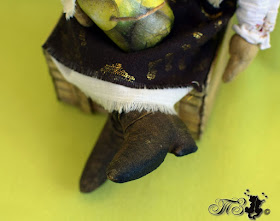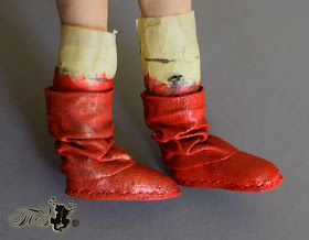 Прим.: Еще раз обращаю внимание на то, что в глубине складок должен просматриваться предыдущий темный слой краски, так сапоги выглядят фактурней. После высыхания всех слоев, также наносим золотистый «налет», и получаем в итоге такие ножки в сапожках: