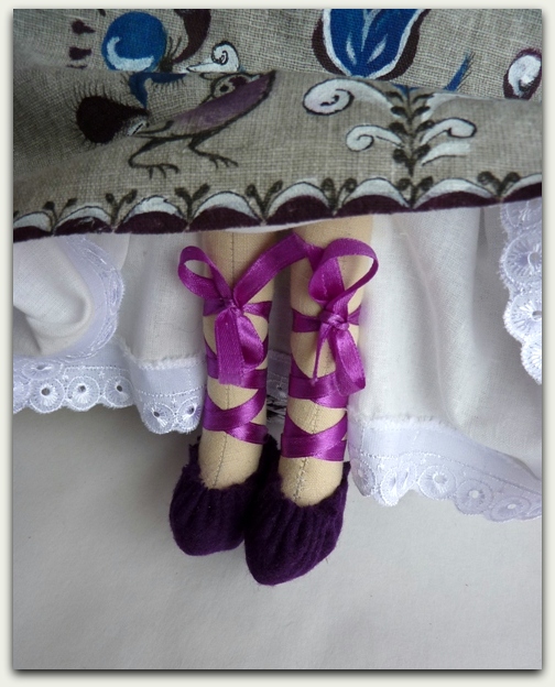 А вот такую обувь сшила для этой куклы - это овал из шерстяной ткани, собранный на нитку и подвязанный лентой.