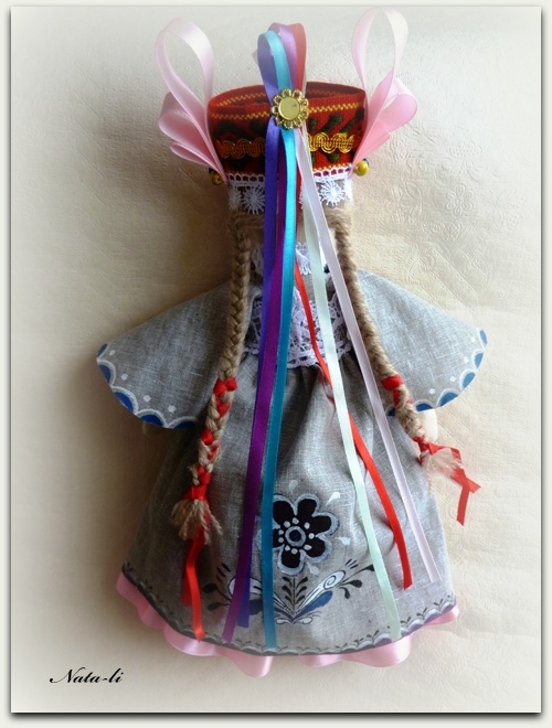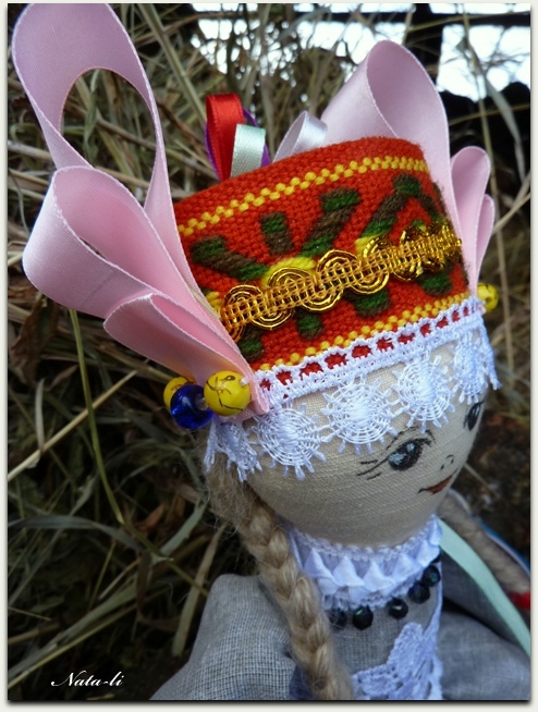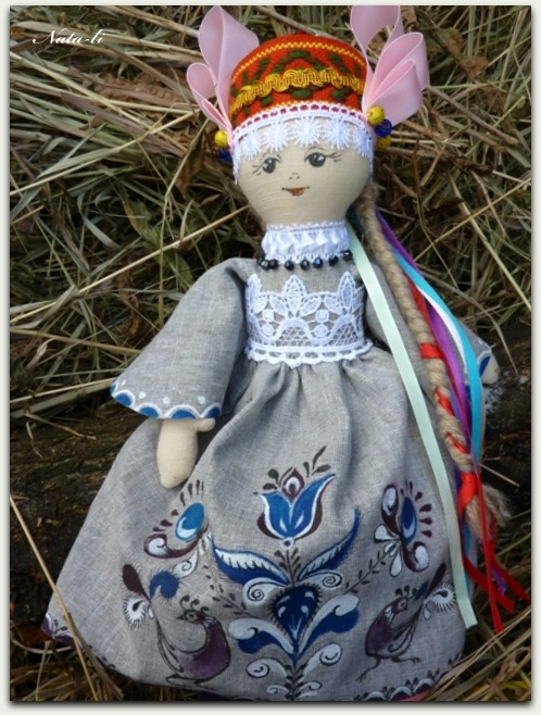 В проекте Северные росписи изучается Уфстюжская роспись. И одно из заданий сделать роспись на ткани. Придумала ляльку в стиле "folk" Это не кукла в национальном костюме, это фантазийный образ. На кукольный головной убор меня вдохновили Елена Москалюк и ее чудесные мотанки.