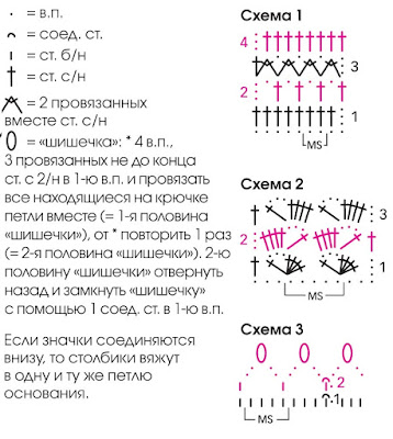 Число петель начального ряда кратно 4. Вязать согл. схеме 3 круговыми рядами. Каждый круговой ряд начать с 1 в.п. подъема и закончить 1 соед. ст.