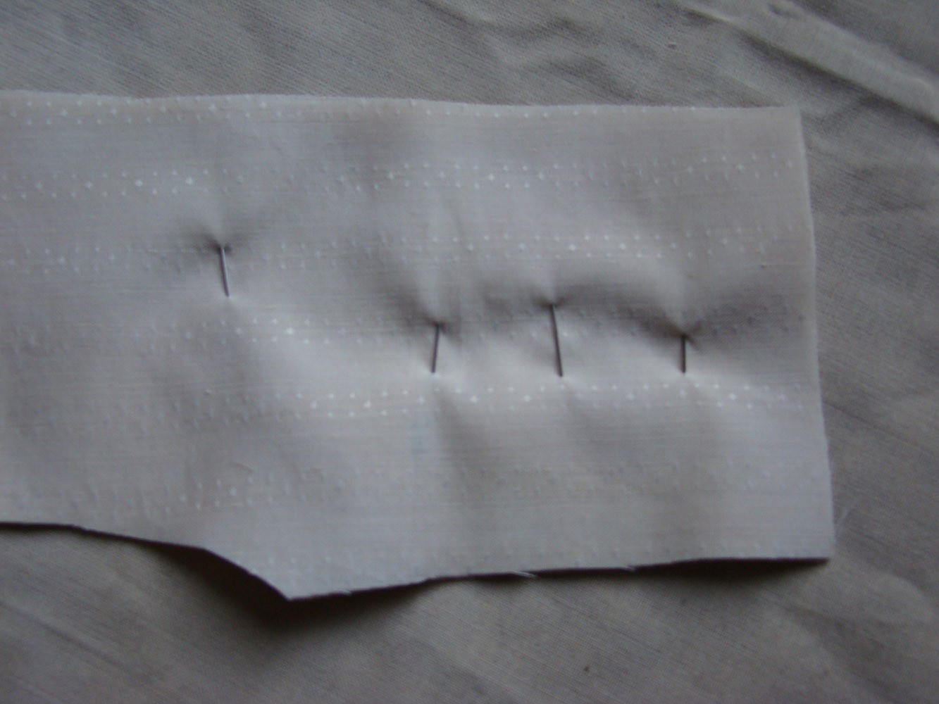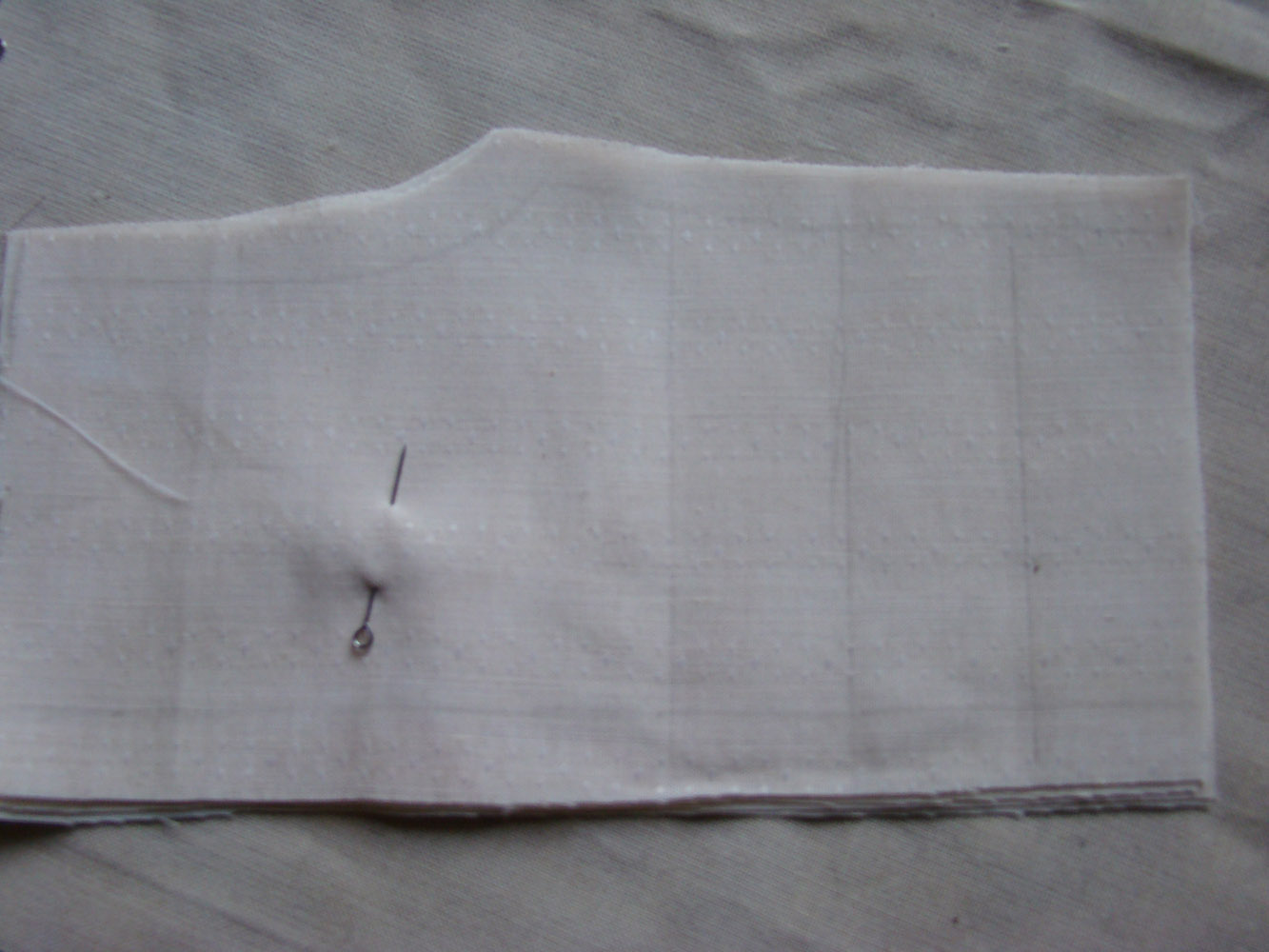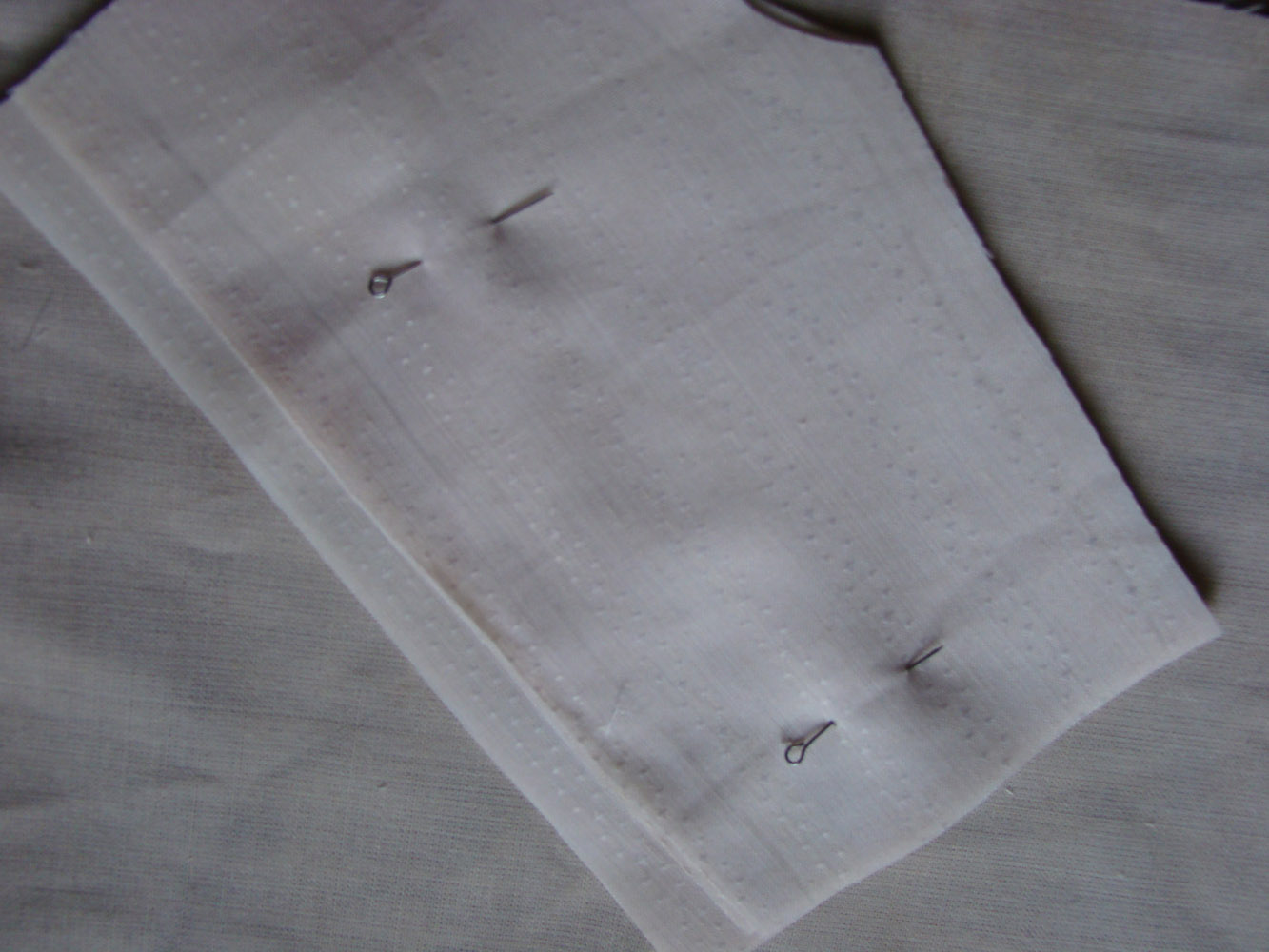 Еще кусочек ткани складываю вдвое лицевыми вовнутрь, на него накладываю вырезанную уже двойную деталь и перекалываю булавки, теперь они держат уже 4 слоя ткани( ткань тоненькая, это получается легко)