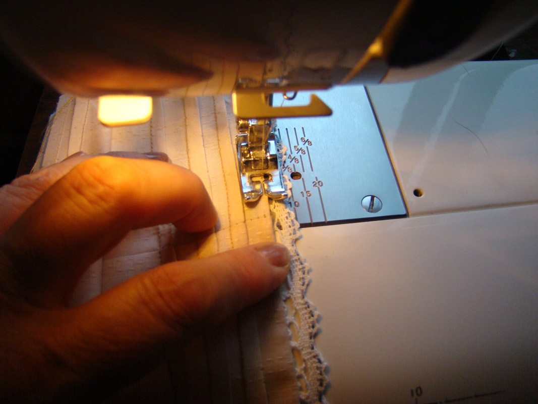 Теперь можно отстрочить в край низ с пришитым кружевцом
