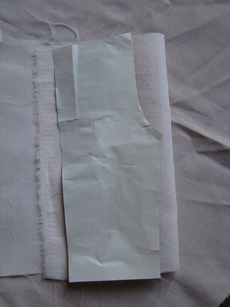 Теперь определим длину пояса . Накладываю этот штанишный бутерброд на полоску ткани, тканька у меня чистый хлопок, потому и без разницы: по долевой я ее разложу или по поперечной. Откладываю от края полосочки одну ширину заготовки и еще одну, это половина пояска будет ( ну, и добавлю пару см на швы и прочее),
