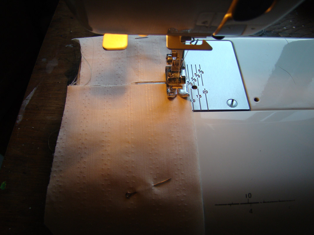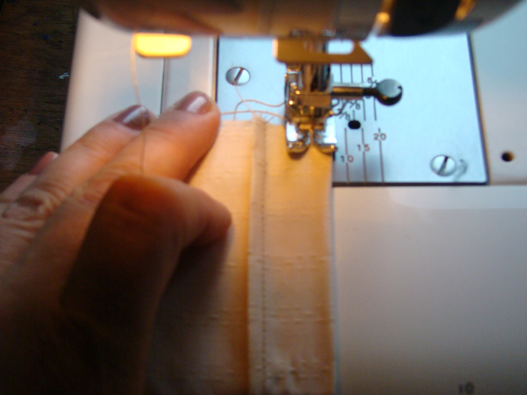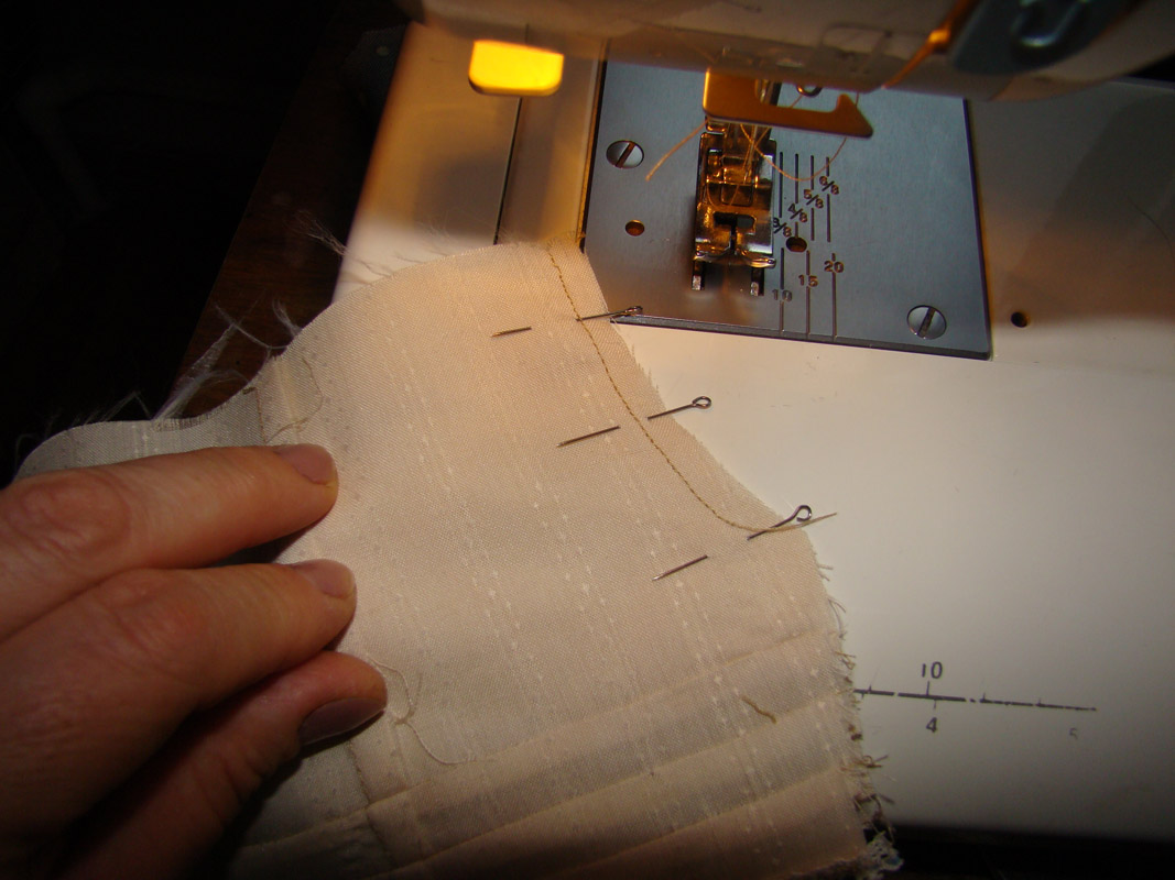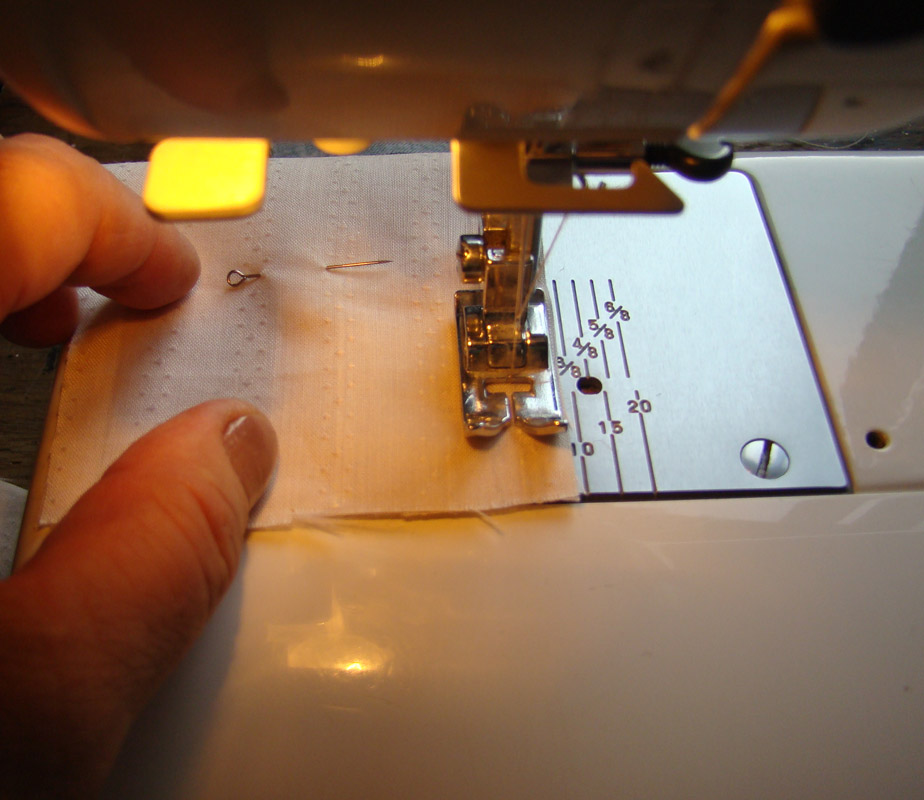 Теперь надо прострочить эти самые защипы, поставив край лапки на заглаженный сгиб.