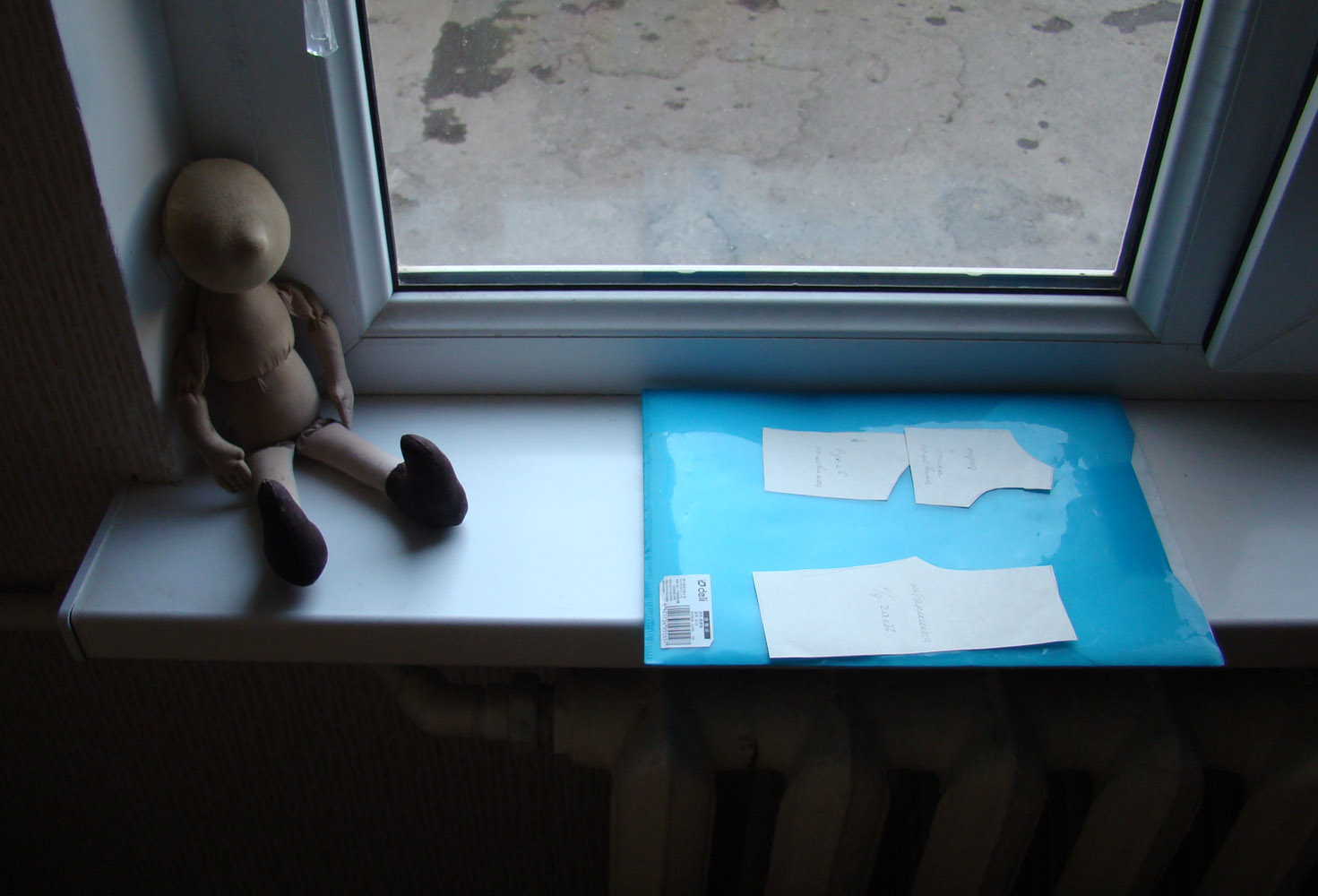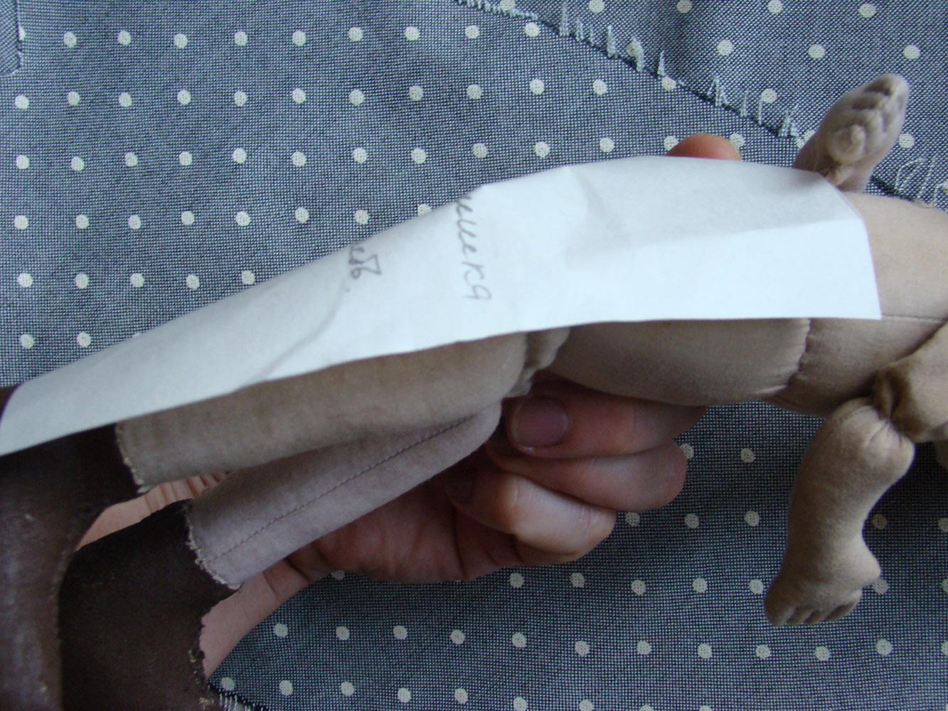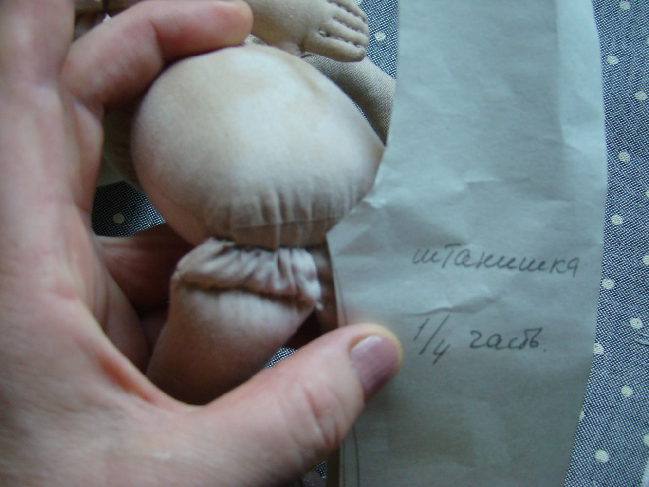 ширина бумажки тоже достаточна, вот видите, как бумажная штанина заходит на бока куколки, вот этого припуска достаточно, чтобы штанишки не были в обтяг . Я держу бумажную половину штанины на половинке ноги куклы.