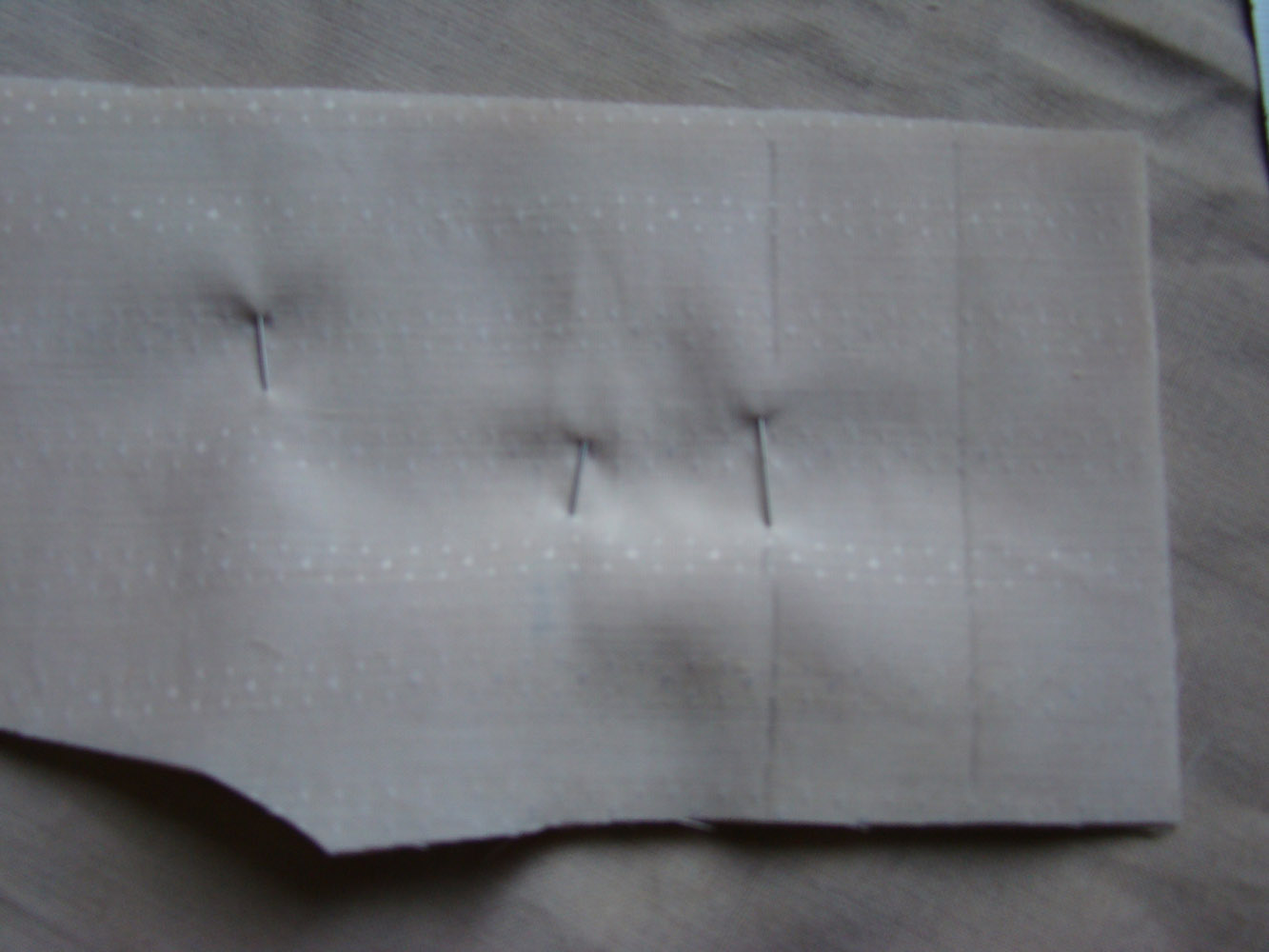 Булавочками проколола по линиям и, перевернув детальку ( все еще в 4 слоя) ,тоже нарисовала линии для защипов прямо по булавкам.