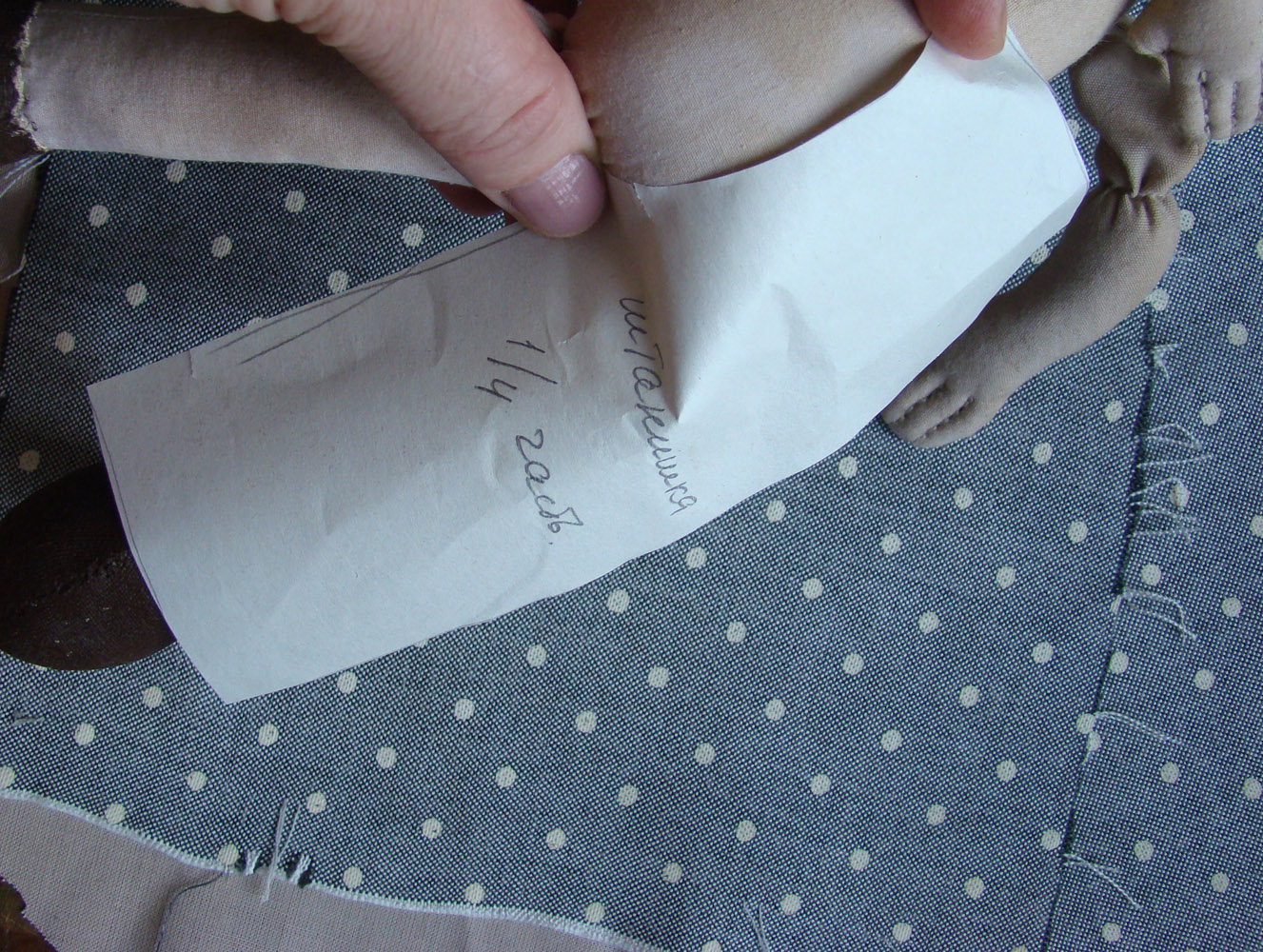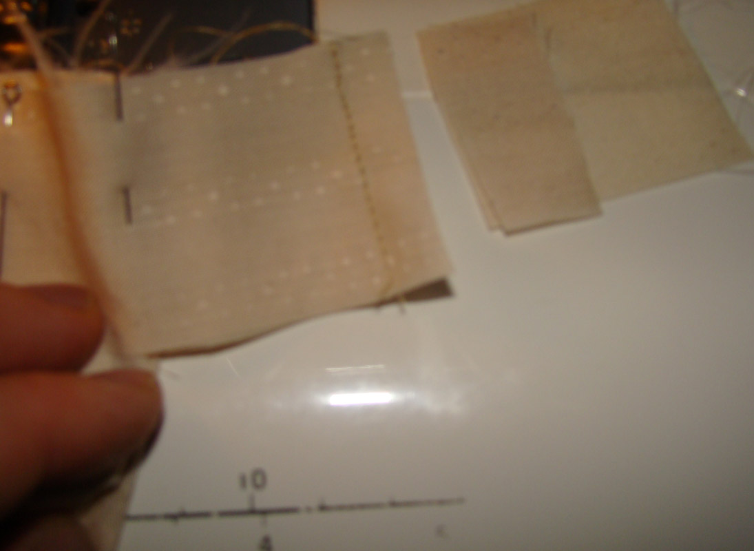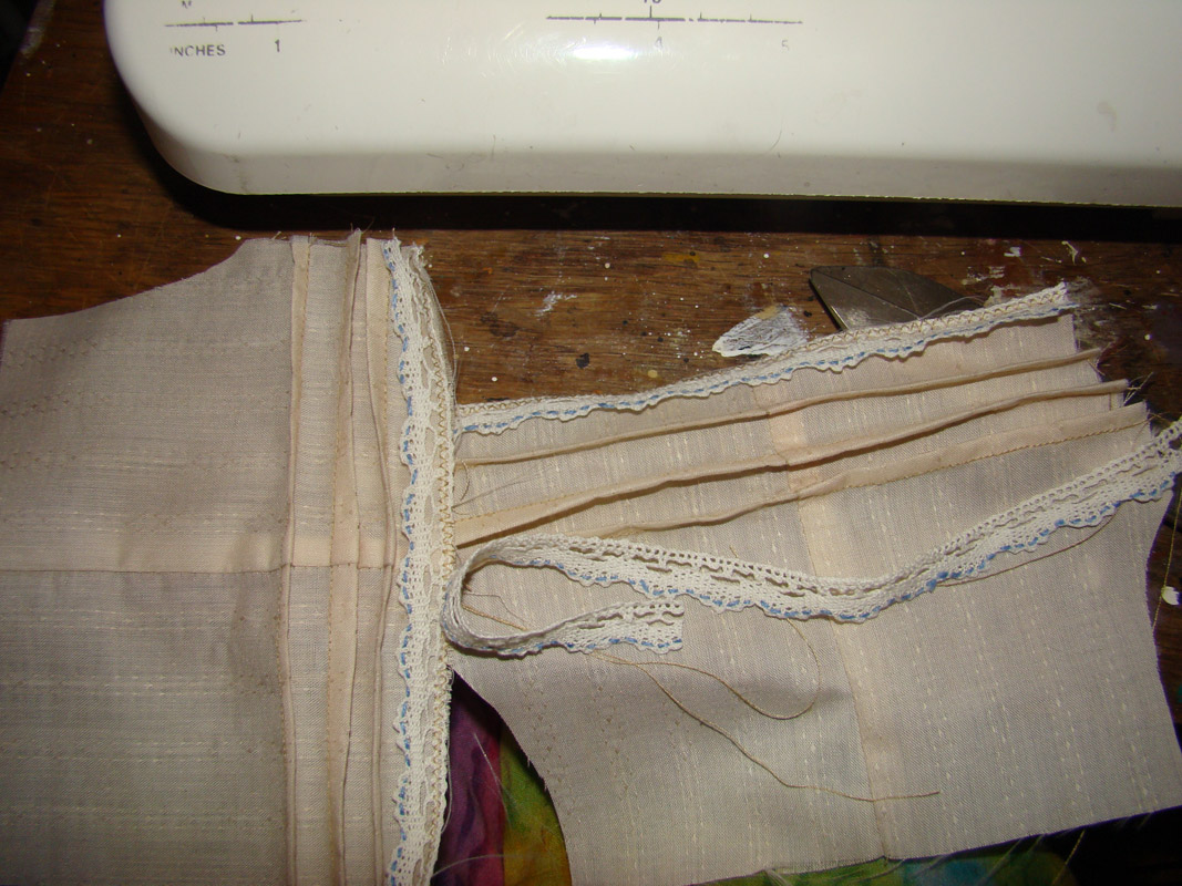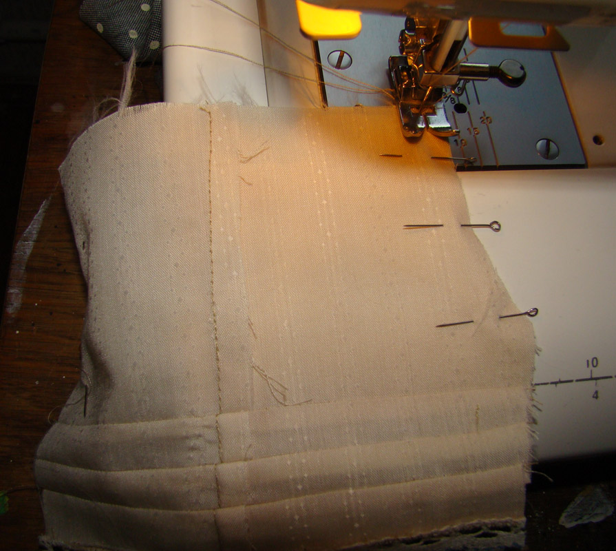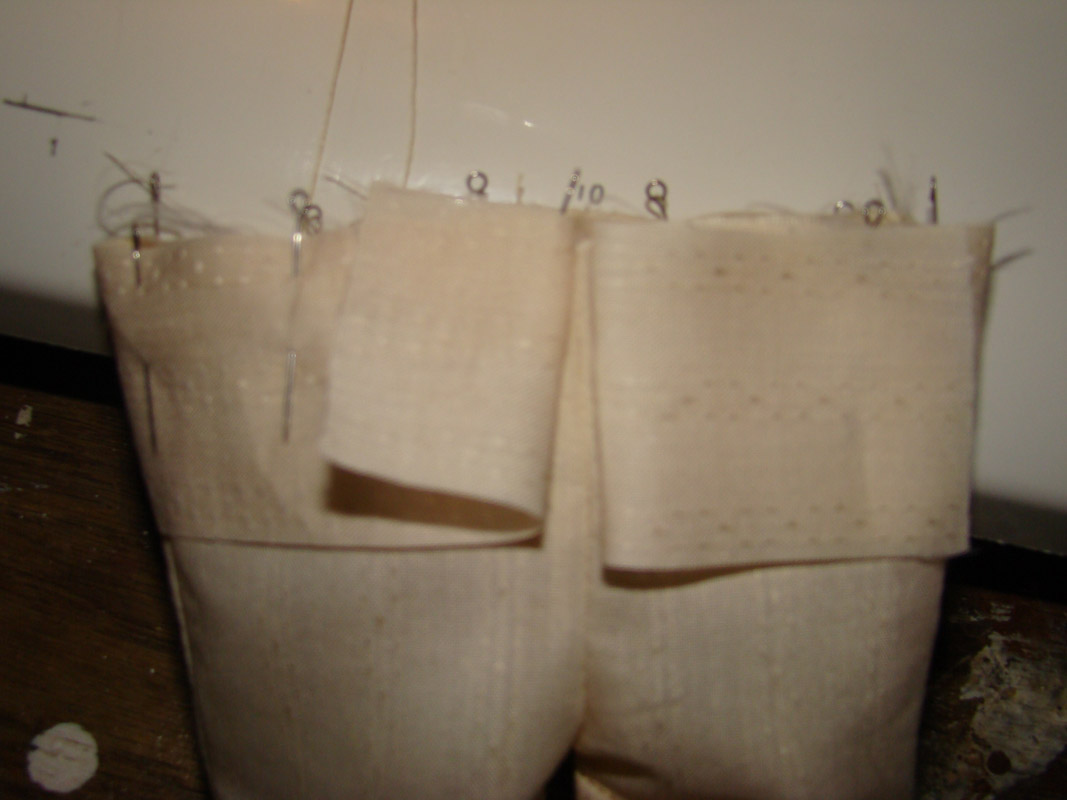Начинаем с панталошек, под руку попался кусочек сорочечной ткани - это на тонкие панталошки с защипами, как у Софи, и плотный хлопковый кусочек - серый в горошек, из него выйдет что-то торчащее в стороны и сильно присборенное, и покороче.