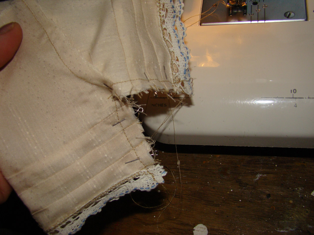 К краю штанины пришиваю кружевцо.
