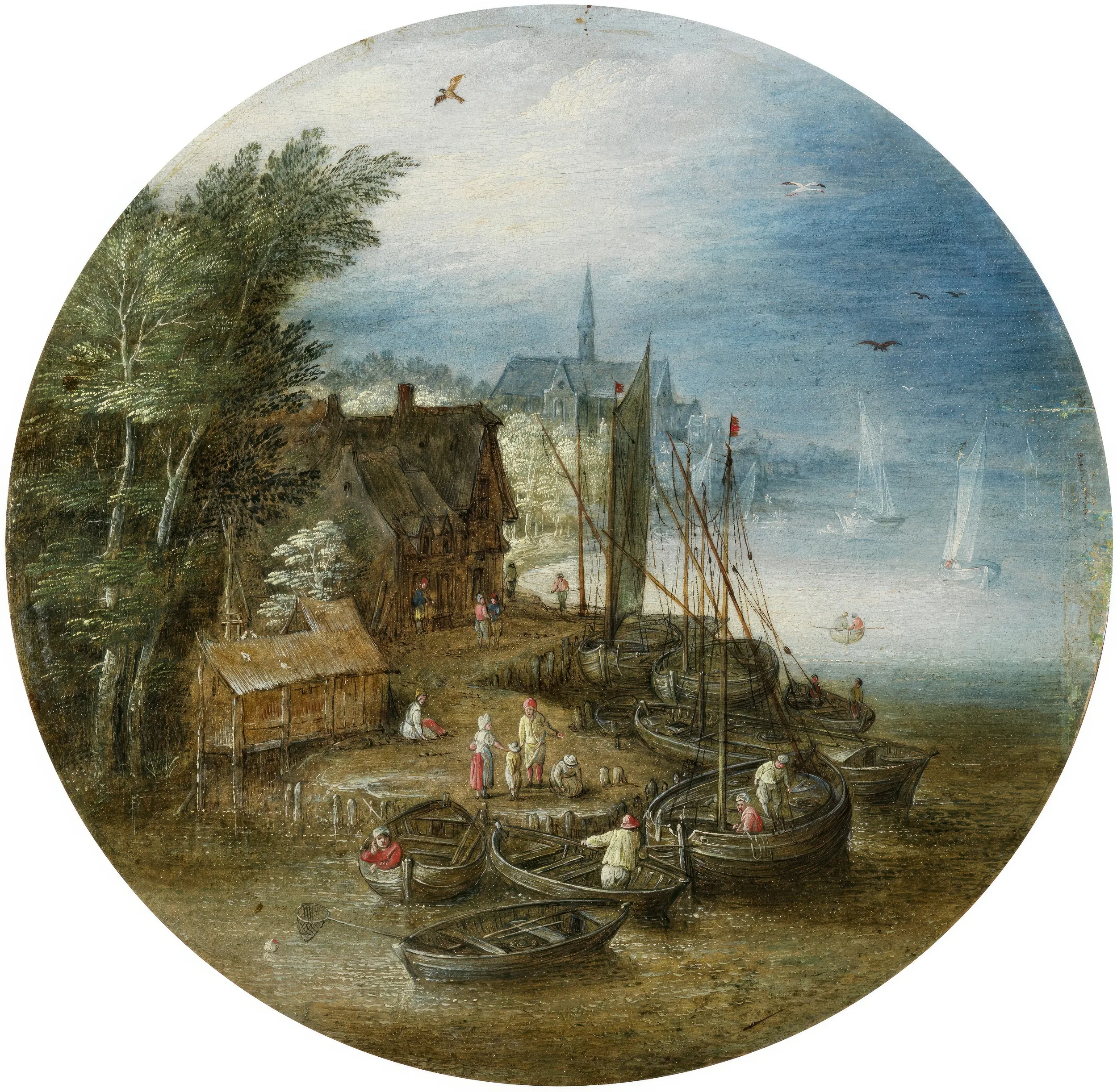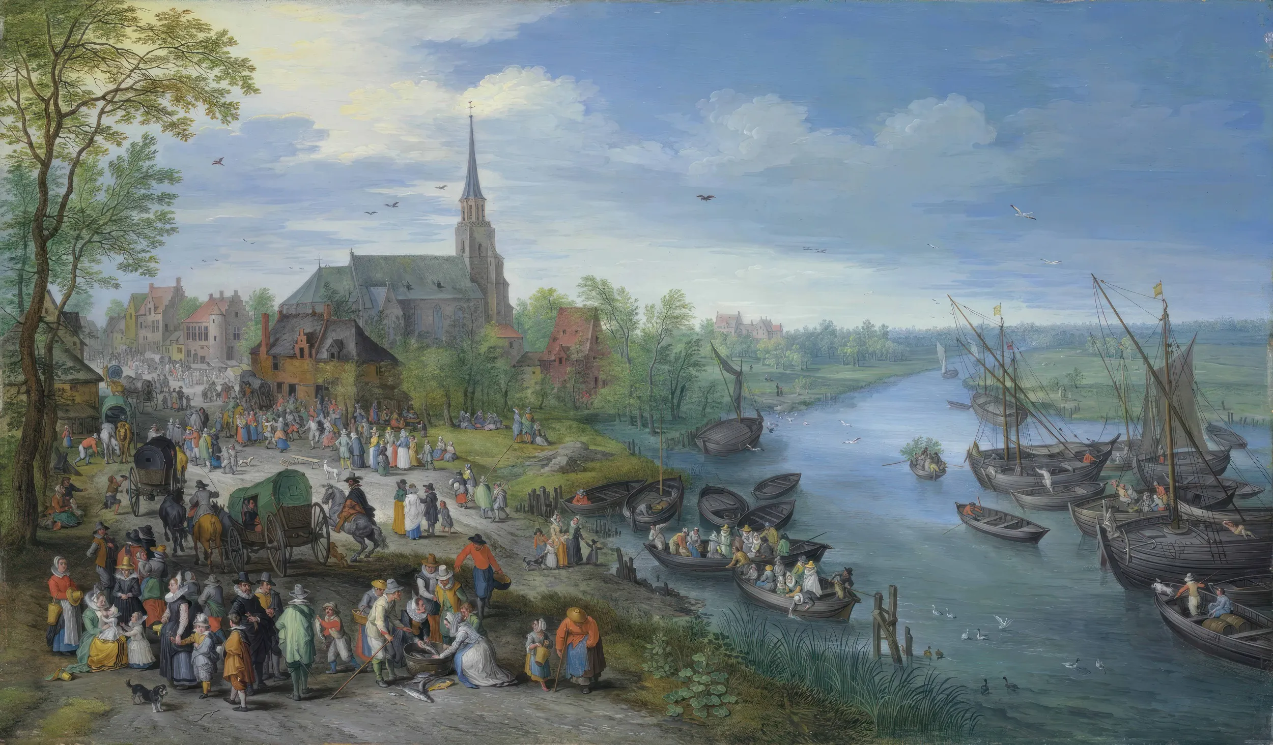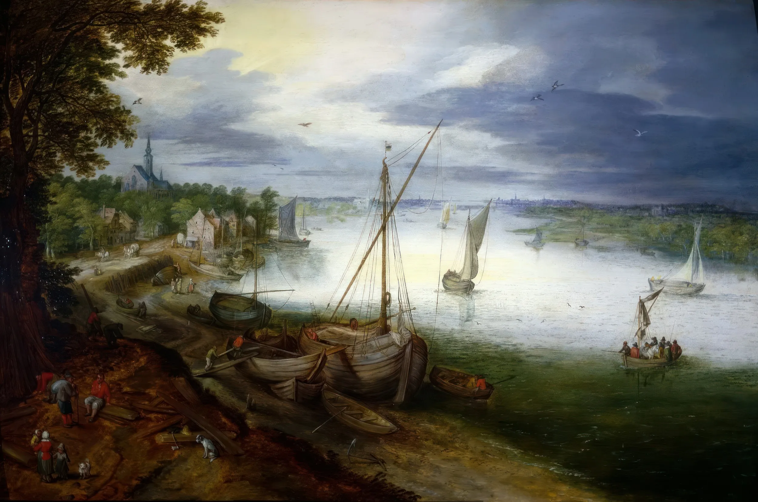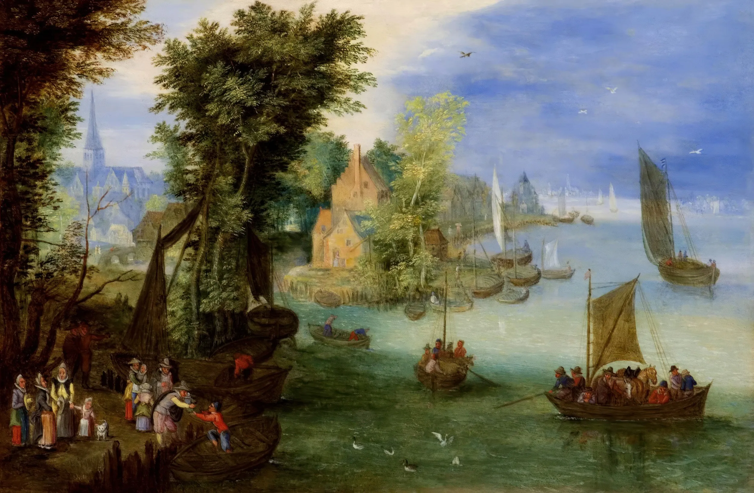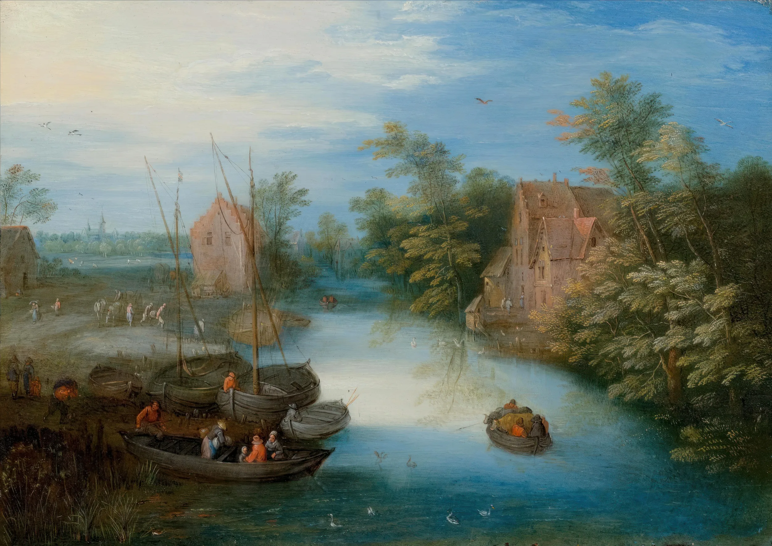 В залитом солнцем деревенском пейзаже несколько персонажей занимаются загрузкой судов. Расположение зданий и фигур слева и справа реки подчеркивает перспективу, которая ведет взгляд зрителя вдоль реки до города вдали – наверное, Антверпена. Ян Брейгель Младший по примеру своего отца, Ян Старшего, написал несколько речных пейзажей с деревенскими сценами и фигурами, что свидетельствует о большой популярности данного сюжета. |