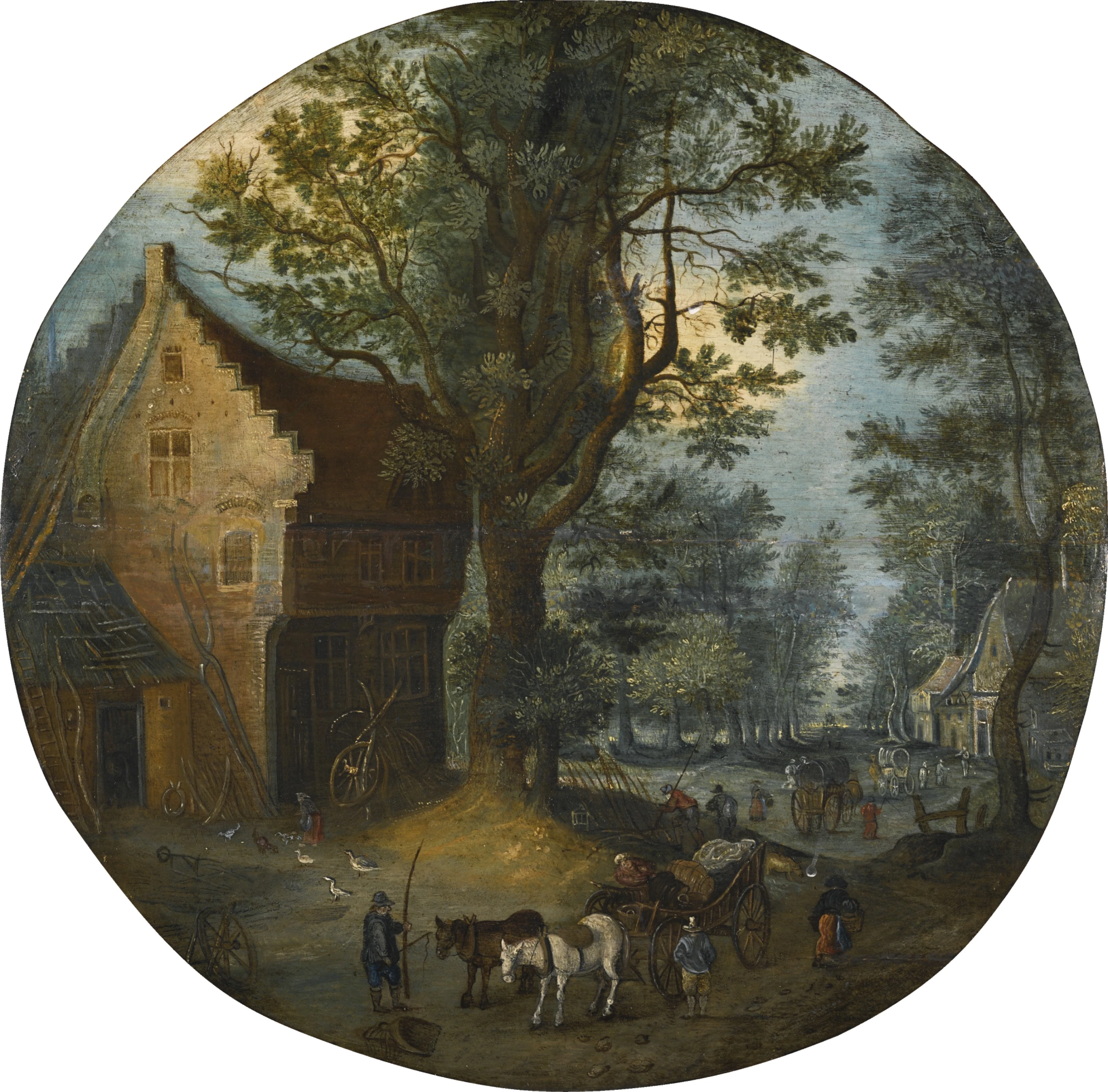 Follower of Jan Brueghel the Younger Village scene with travellers oil on oak panel, painted as a roundel