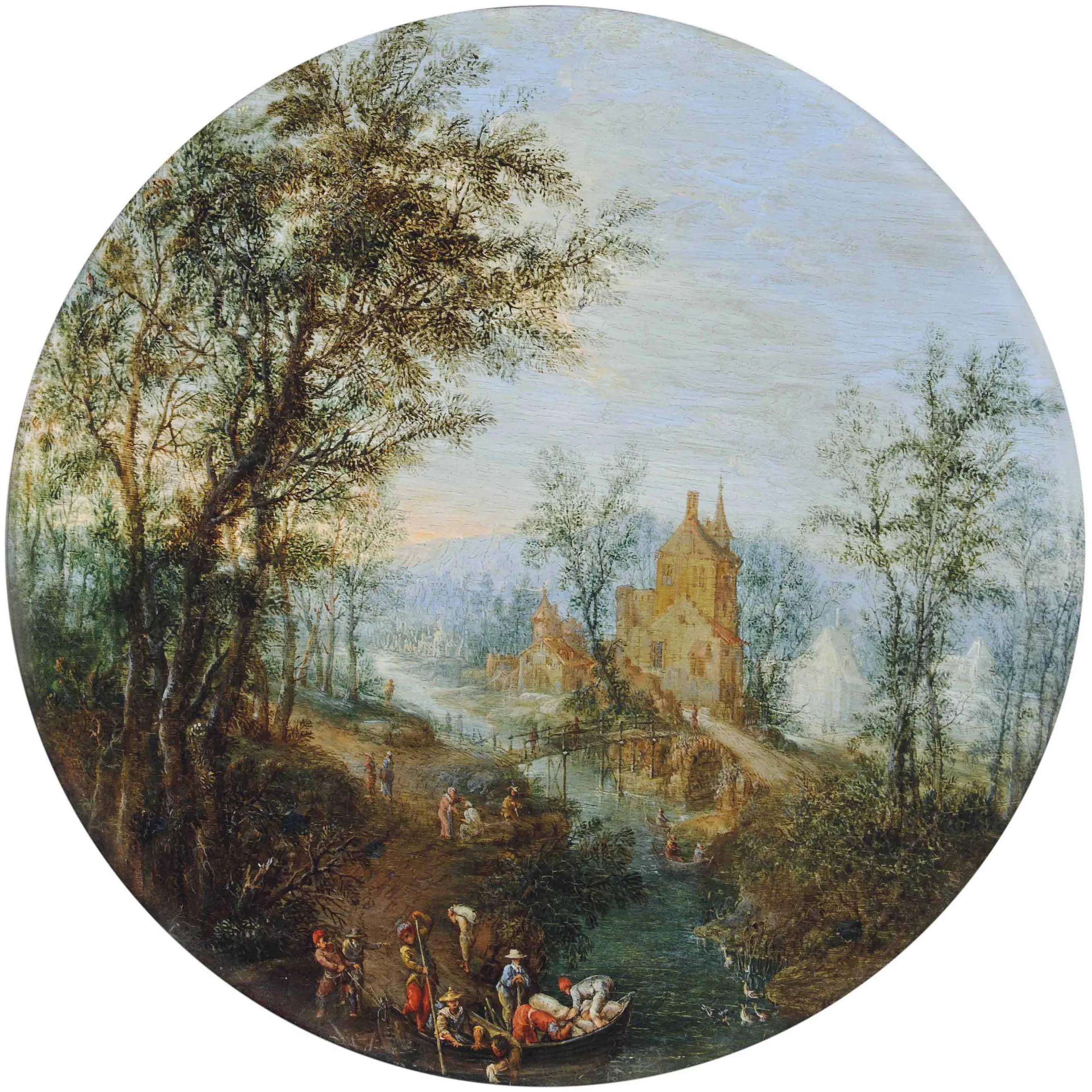 Circle of Jan Breughel II (Antwerp 1601-1678) A wooded river landscape with travellers loading a boat near a bridge and figures on a path, a village beyond