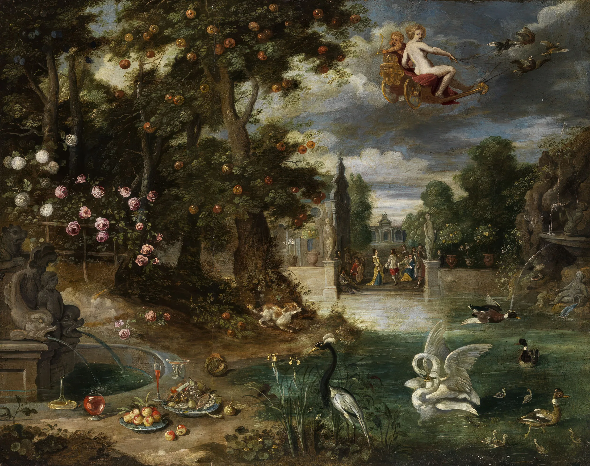 Attributed to Jan Brueghel the Younger (1601–1678) Höfisches Fest in einem Lustgarten (oder Die Triumphgaben der Liebe). Öl auf Kupfer. 70 x 87,3 cm. 1678 Hampel Auctions