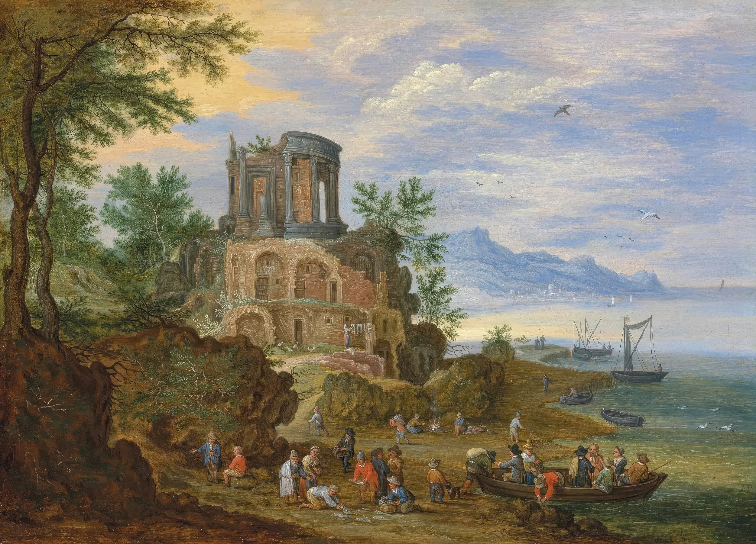 (атр) Jan Brueghel the Younger (1601–1678) Каприччио с храмом Сивиллы в Тиволи рядом с морем (Capriccio with temple of sibyl in Tivoli, near the sea) 21.3 х 29.6_д.,м. Частное собрание