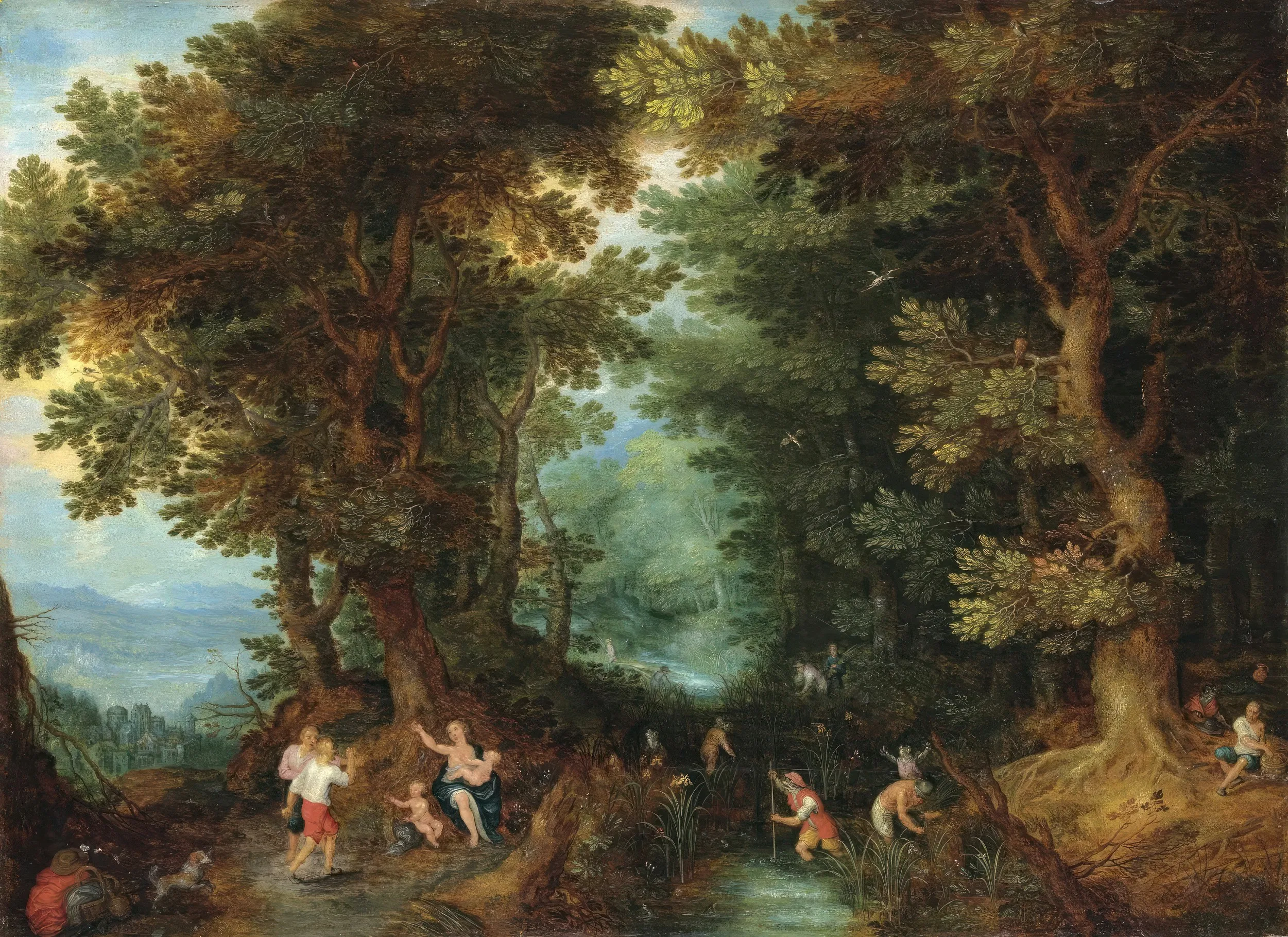 (совм с кругом Хендрика ван Балена) Лесной пейзаж с мифологической сценой (Forest Landscape With Mythological Scene) 55.5 x 90_д.,м. Частное собрание