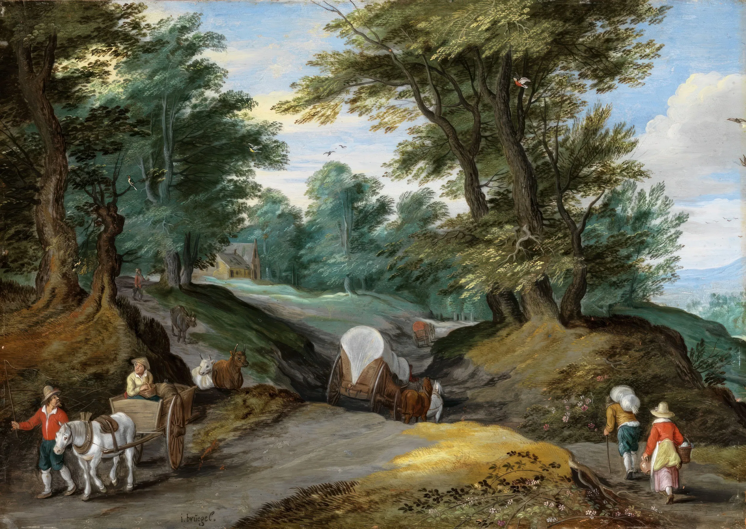 Путешественники с телегой и повозкой (Travelers with carts and a wagon on a country road) 12.1 x 20_медь, масло Частное собрание