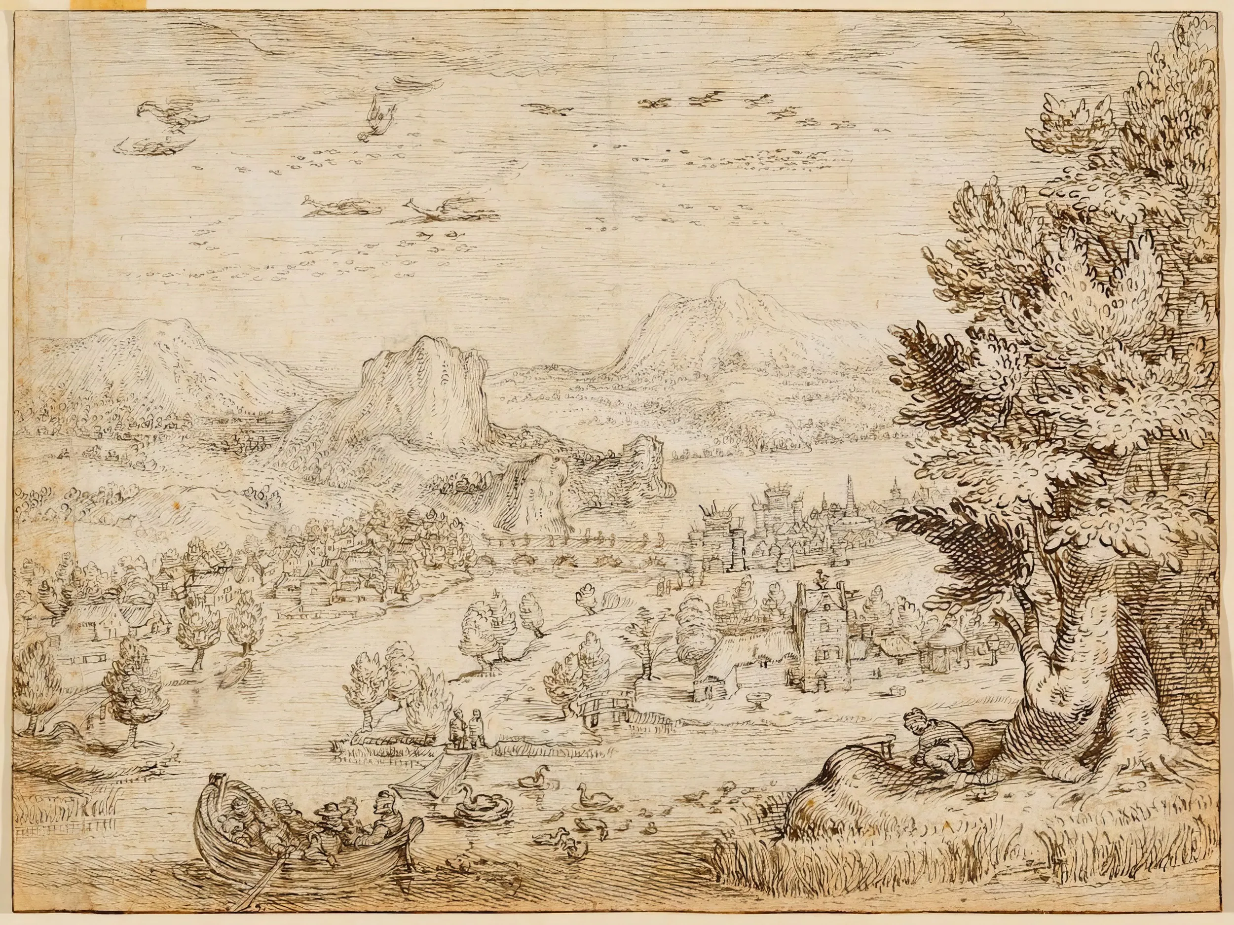 Joos de Momper the Younger (1564–1635) Jan Brueghel the Younger (1601–1678) River landscape with cottages and cattle, Antwerp in the distance Речной пейзаж с домами, стадом и Антверпеном вдали between circa 1625 and circa 1635 Johnny Van Haeften Gallery