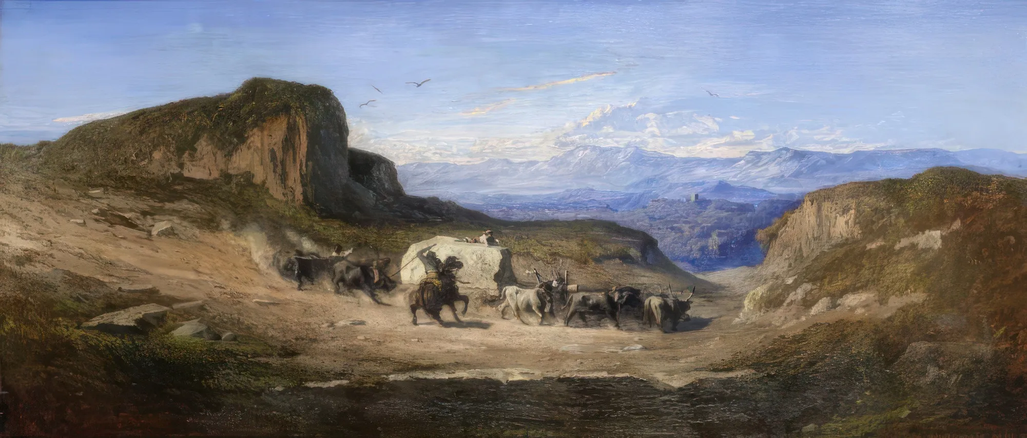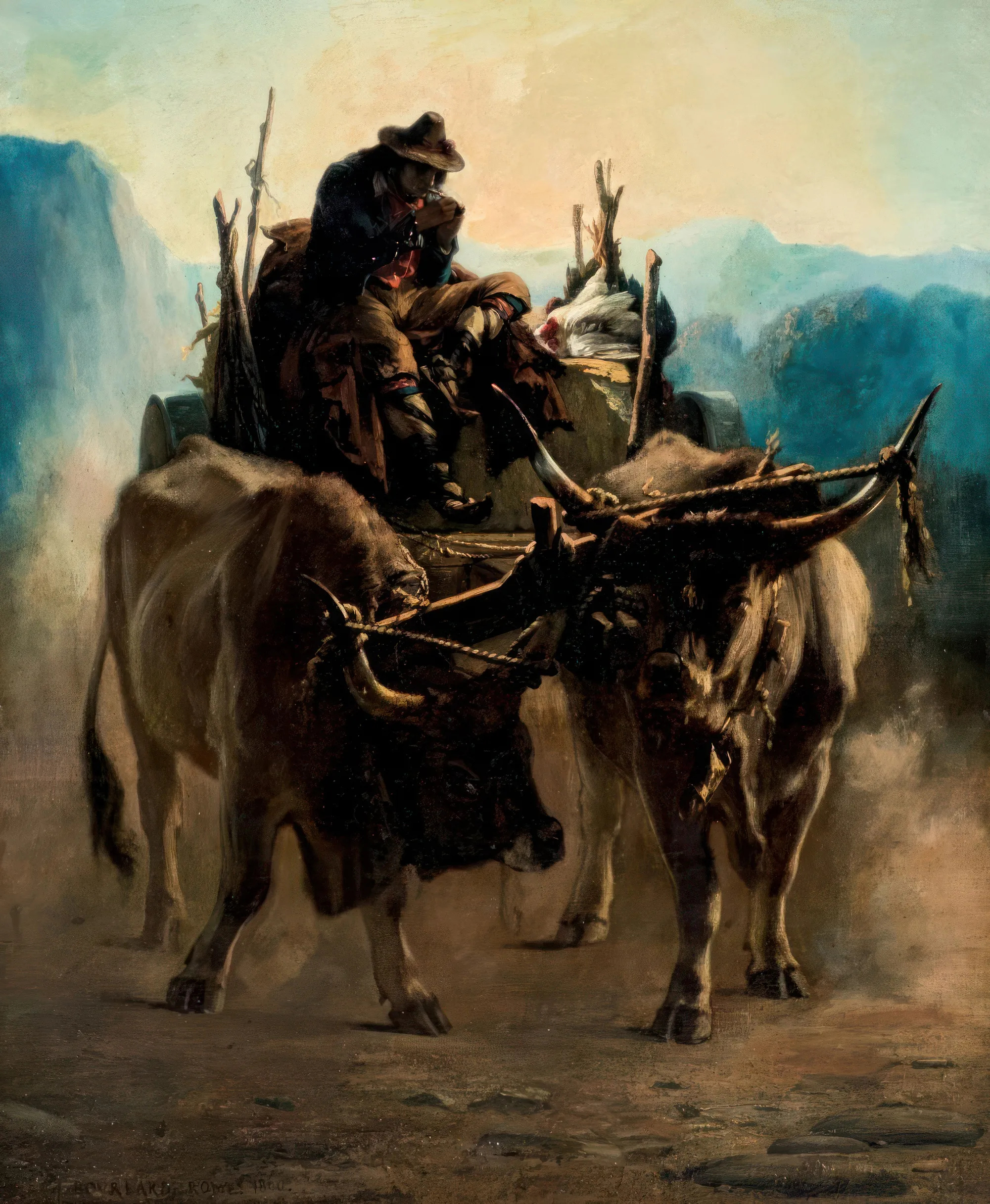 Стадо волов с погонщиками везёт глыбу каррарского мрамора из каменоломен Апуанских гор в Тоскане в город Каррара