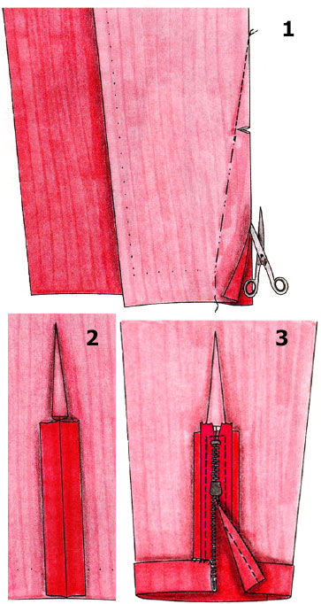Удалите из разреза сметочную нитку. Заметайте края разреза. Застежку-молнию притачайте под края разреза от размеченной линии нижнего края.