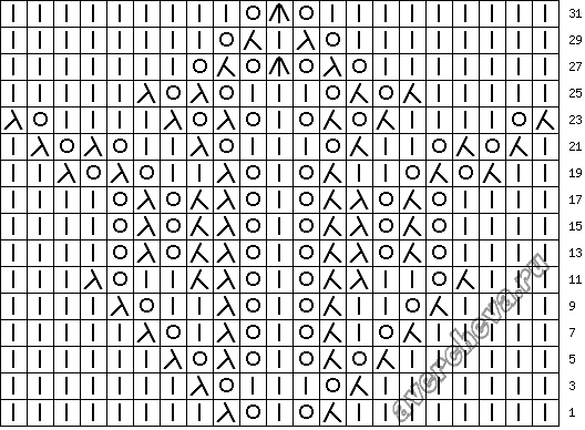 Мотив узора шириной 21 петлю, в высоту 31 ряд