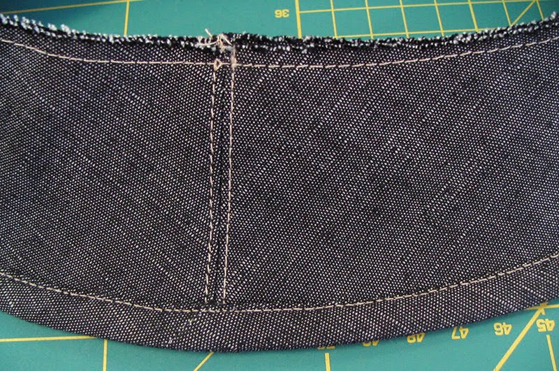 Brim: Pin and stitch upper and lower brim panels together in pairs (brim front + brim back). Press seams open and top-stitch them on both sides of seamline. Pin brim halves together, wrong sides facing, and machine-baste their outer and inner edges together, placing stitching close to edge.