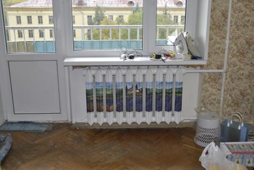 Примерив мотив на батарею начинаем приклеивать, чтобы он шел примерно посередине батареи.