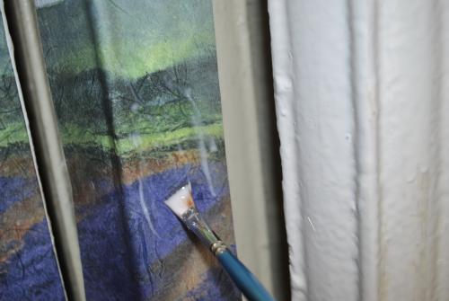 Клей ПВА я разбавляла, т.к. он так лучше ложится на бумагу. Начинаем с середины изображения.