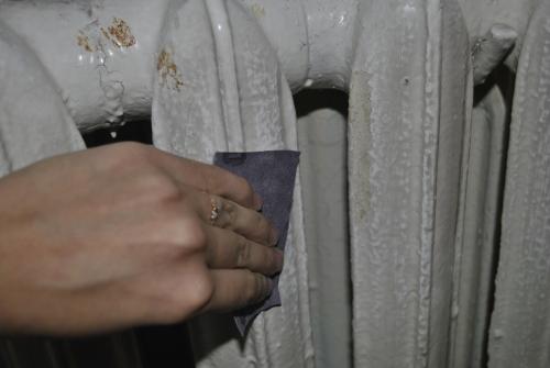 Для начала батарею нужно хорошенечко вымыть и пошкурить. Сильно шкурить я не стала, не было цели полностью снять старую краску.