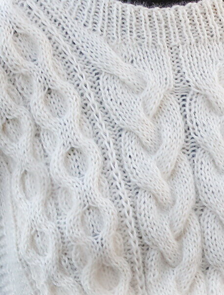 Теперь снять средние 14 петель на держатель петель для горловины и закончить каждое плечо отдельно. Продолжайте вязать столько петель узора, сколько будет соответствовать горловине, и вяжите лицевыми над лицевыми и изнаночными над изнаночными над петлями в косе в A.2. Затем закрыть петли в каждом ряду от горловины следующим образом: закрыть 3 петли 1 раз, 2 петли 1 раз и 1 пет 1 раз = 46-49-52 петли. На высоте 60-64-68 см, 1 ряд лицевыми с лицевой стороны, при этом равномерно убавляя 17-17-17 петель = 29- 32-35 п. Закройте. Провяжите второе плечо таким же образом.