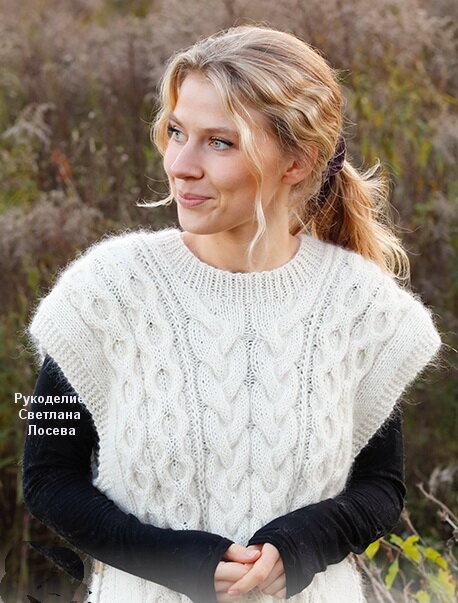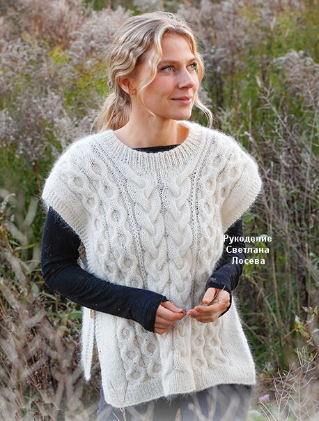 Предлагаю связать очень интересную модель жилета узорами с косами и шлицами по бокам от DROPS