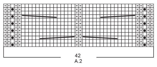 Теперь вяжите узор следующим образом: 5 петель платочной вязкой, 9-14-23 петли лицевой гладью, A.1 над следующими 28 петлями (= 2 повторения 14 петель), A.2 над следующими 42 петлями, вяжите последние 12 петель по схеме A.1, вязать по схеме A.1 над следующими 14 петлями, 2 изнаночные, 9-14-23 петли лицевой гладью, 5 петель платочной вязкой. Продолжайте в том же духе.