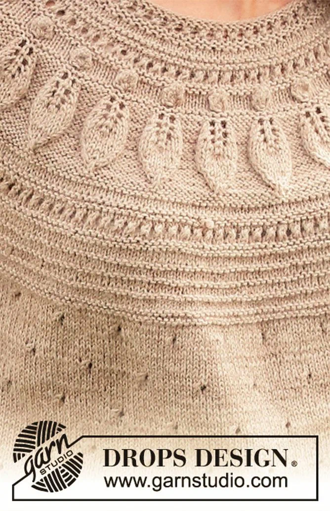 Изделие вяжется сверху вниз круглой кокеткой с узором в виде ажурных листьев.