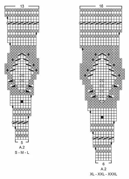КОКЕТКА: Вязать A.2 по кругу (= 27-29-32-28-29-30 повторений из 5-5-5-6-6-6 петель). Продолжайте эту схему и прибавляйте, как показано на схеме.