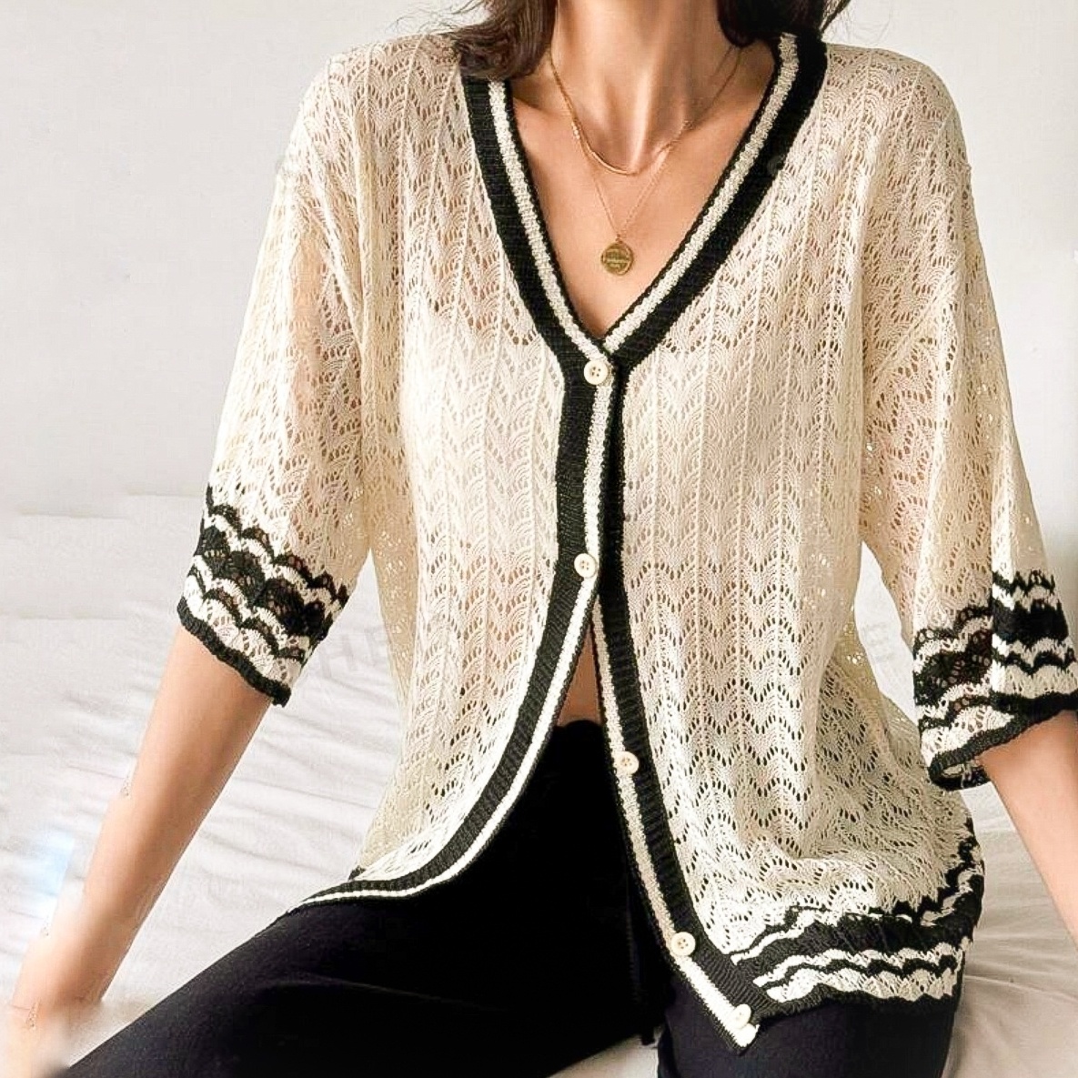 Кофточка свободного силуэта. Длина чуть ниже бедер, что позволяет носить её как в качестве самостоятельного верха, так и в качестве второго слоя, например, поверх топа.