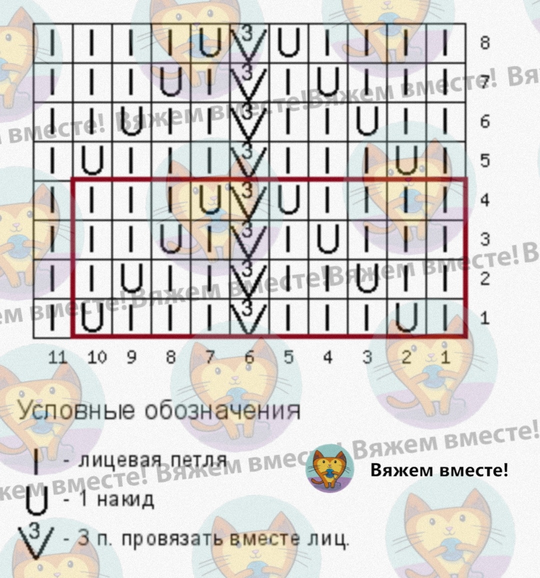 Раппорт узора равен 10 петлям и 4 рядам, выделен красной рамкой.