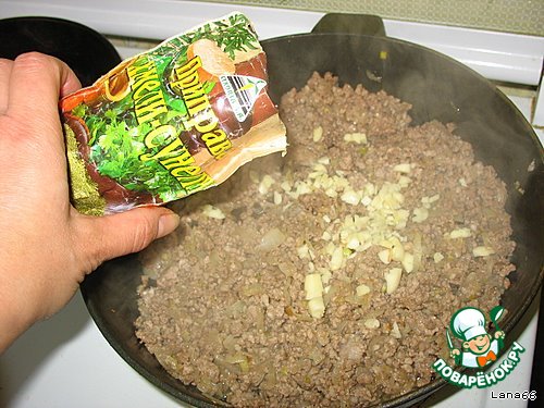 Измельчить чеснок (я давлю плоской стороной ножа, а потом его режу). Когда фарш обжарился до золотистого цвета, добавляем в него чеснок и приправу хмели-сунели, перемешиваем и даем еще 30 секунд ему поджариться. |