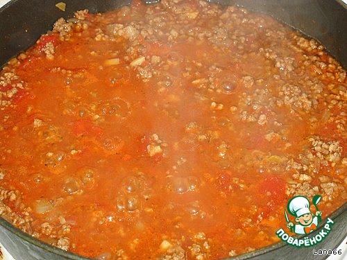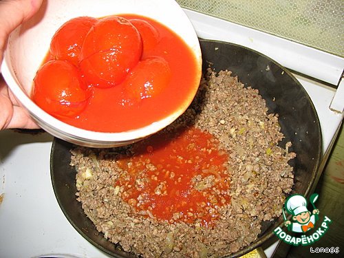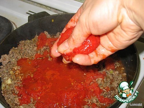 Фарш должен быть не очень жидким, но и не густым. Поэтому не выливайте сразу всю томатную жидкость. Лучше потом добавить. Пробуем, солим, перчим. И оставляем потомиться минут на 5-10. |