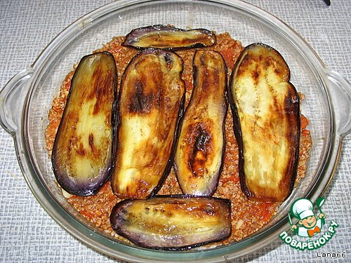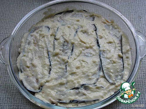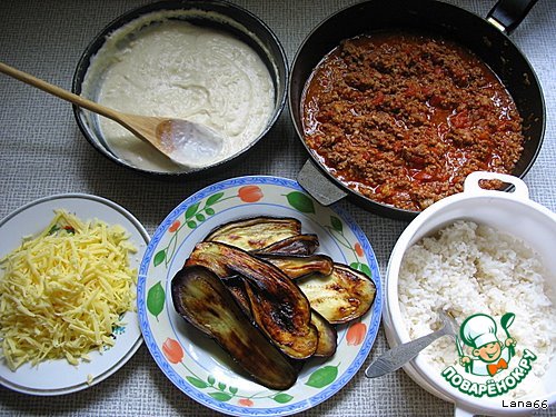 половину соуса Бешамель. Слои повторить: рис, фарш, баклажаны и соус Бешамель. |