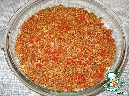 На дно стеклянной жаропрочной формы укладываем послойно половину риса, |