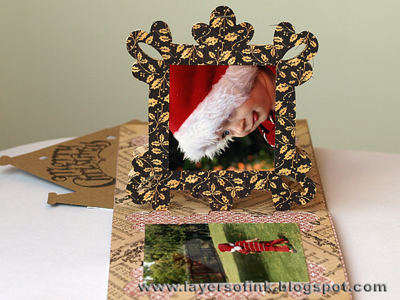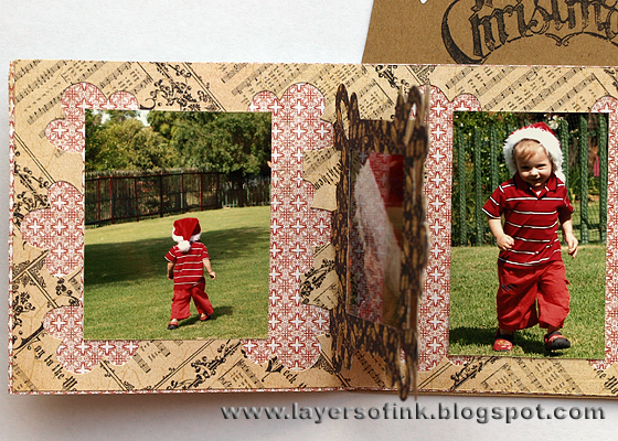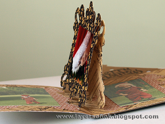 I used a whole bunch of Karen Burniston's Hearth & Home Pop 'n Cuts dies. Pop-ups aren't only for cards, but can add a real fun interactive element to mini-books and layouts. It is also a great place to add extra photos or journaling. This is the Square Ornate 3-D Frame pop-up.