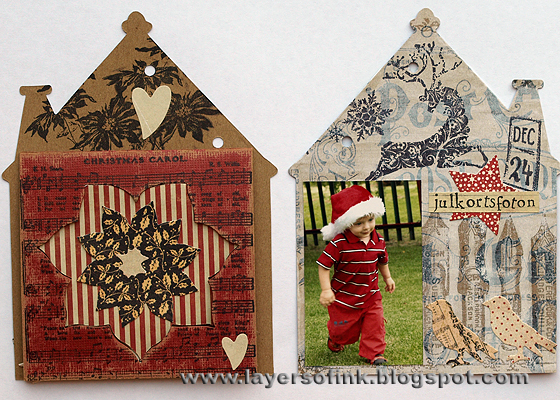 This heart was inked with Antique Linen and Frayed Burlap, misted with Biscotti Perfect Pearls mist and then stamped with alphabet stamps. I used a piece of kraft resist for the door, and covered up the '25' of the paper with letter stickers, also coated with Glossy Accents. In Sweden, the main family day of Christmas is Christmas Eve.