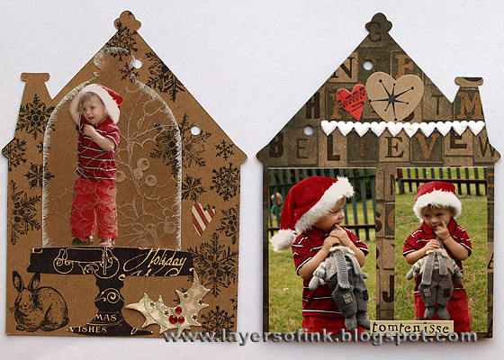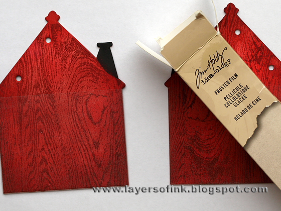 I cover the lower part of house (below the roof) with Tim Holtz's new Frosted Film. This gives a great subtle shimmer to the house, and also protects the covers from dirty little fingers.