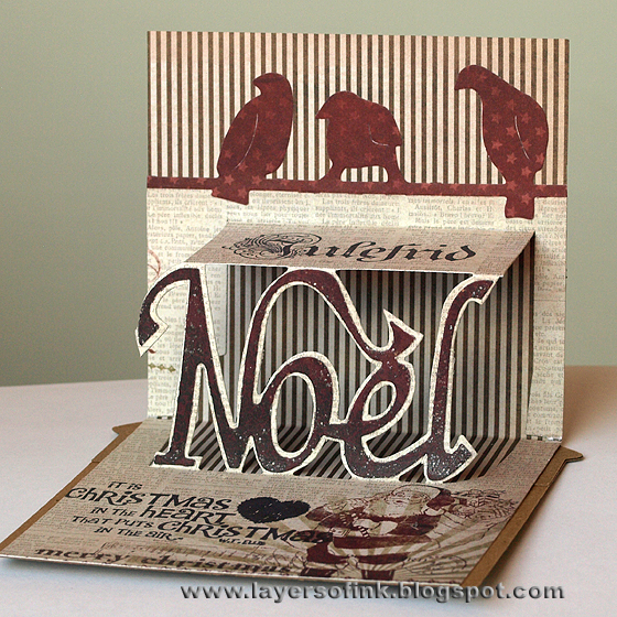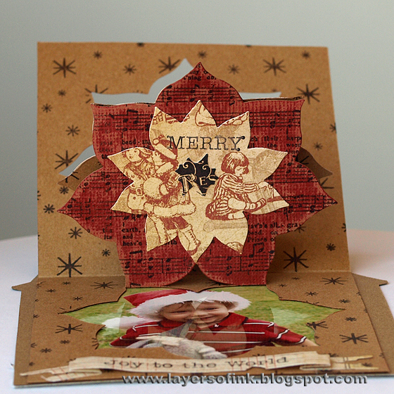 Tim Holtz's new Holiday Wreath was die cut from ledger paper and I added some white pen marks to define the leaves. The bow was die cut from kraft core and sanded lightly. You don't always have to mount pop-up on another sheet of paper. Here the star of the pop-up shows on the outside too, since I didn't mount it on another paper. When you lift the flap, you see this:
