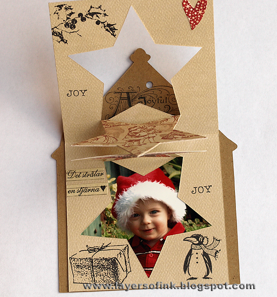 For some of the sentiments I used a stamp with Swedish Christmas songs, cutting the titles of the different songs out. Lots of stamping too of course. From scraps of the patterned papers I used, I die cut a lot of stars, and different hearts. The secret inside the album, are the pop-ups, turn the flap to the left and you find this: