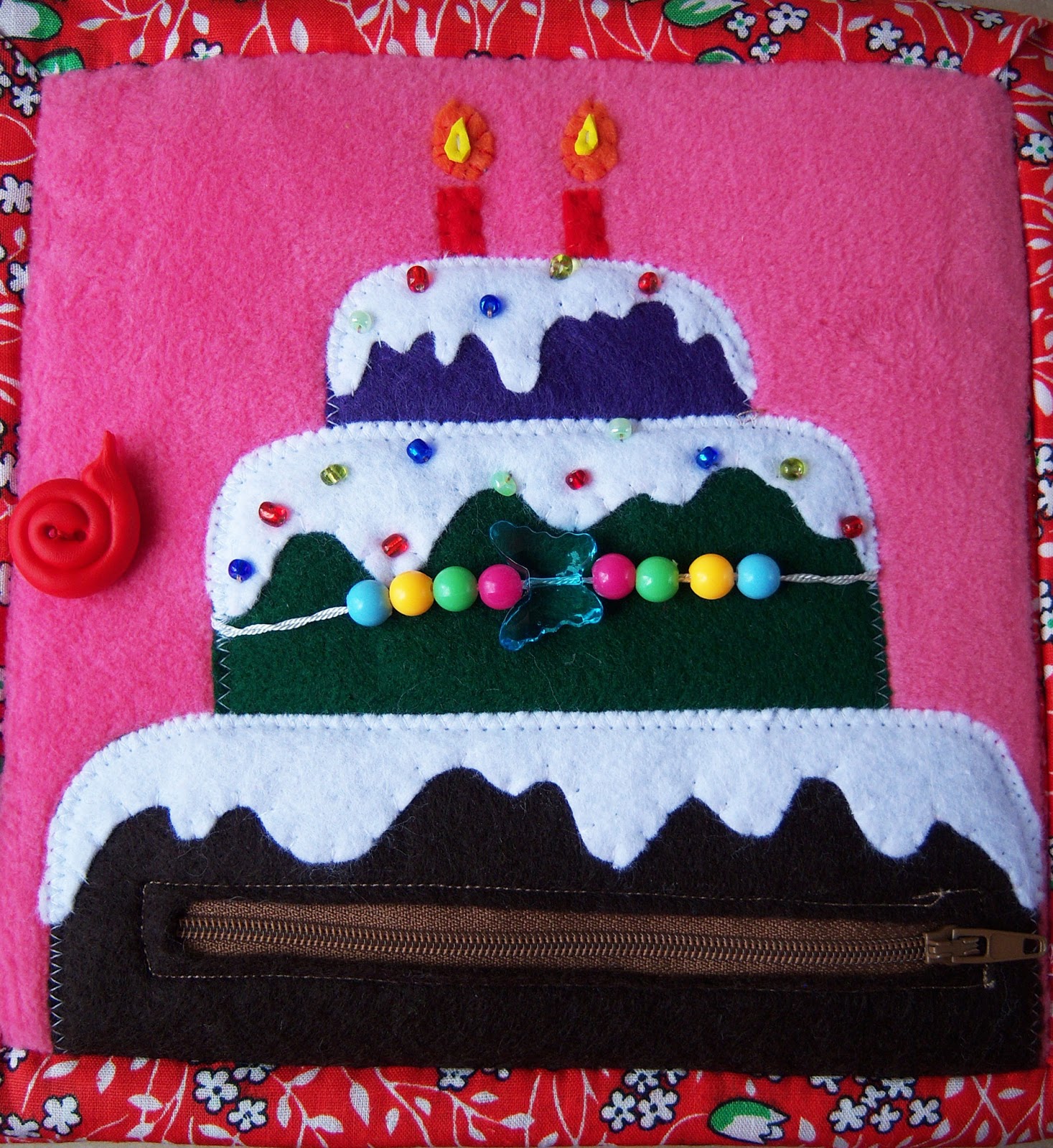 Обкладинку теж вирішила задіяти. Зворотня - торт з двома свічками. На середньому ярусі - бусини на шнурівці - можна перетягувати, рахувати.