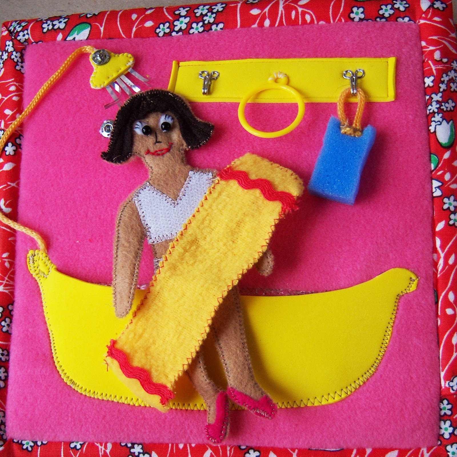 шафа, дверці якої закриваються на гачок, в шафі - одяг ляльки - сукні, светр, штани, спідниця, блузка - все має зі звороту липучку. На ляльці - трусики та майка з іншої частини липучки, на дверях шафи дві стрічки за якими можна зберігати одяг та саму ляльку :-))) Пам'ятаєте, в дитинстві в нас були такі ляльки з паперу? :-)))