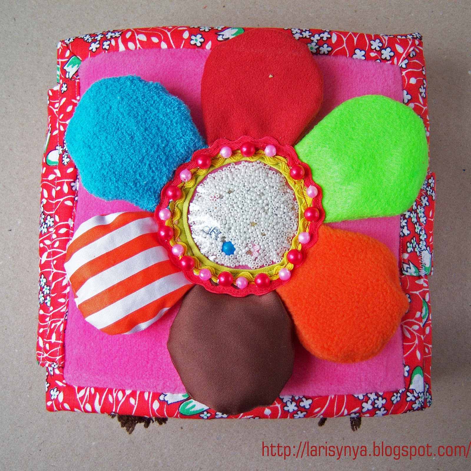 Лицева сторона - квітка, пелюстки якої наповнені: синтапоном, плівкою, горохом, дзвониками, пластиковою сіточкою... серединка - своєрідна варіація "іграшки-шукача"