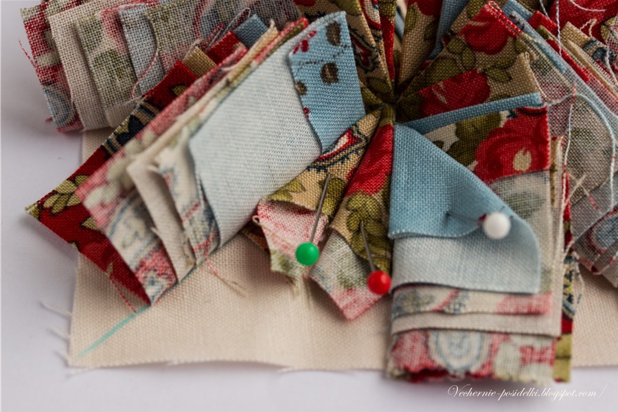 Выложенный ряд можно сколоть, а можно сшивать не скалывая. Мне удобнее второе, т.к. детали мелкие и слишком сильно бугрятся от булавок. Но вы смотрите, как вам удобнее. Начинаем сшивать от центра к краю по начерченной линии, хорошо затягивая стежки. Шов такой же как «назад иголку», только стежки проложены на расстоянии друг от друга. Первый стежок (в центре) можно даже сделать двойным для верности. Очень важно: каждый стежок должен приходиться точно на верхний край прямоугольной детали (см. фото).